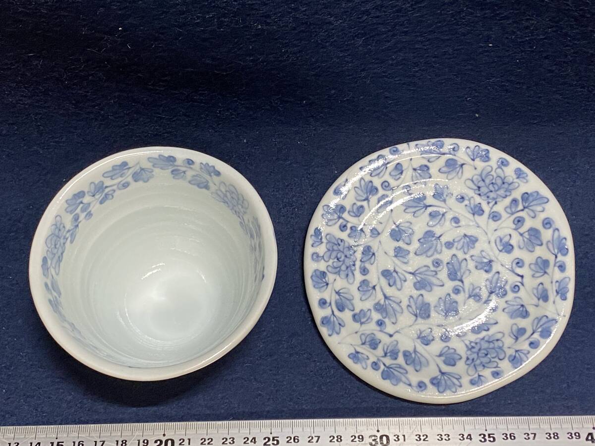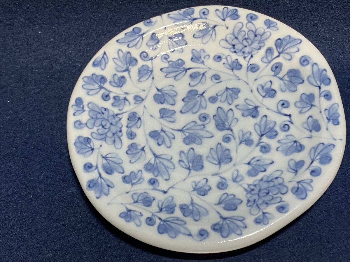 軽く指で弾くと堅焼きの高い音色がし、陶器で白磁に青絵の花柄の感じです。