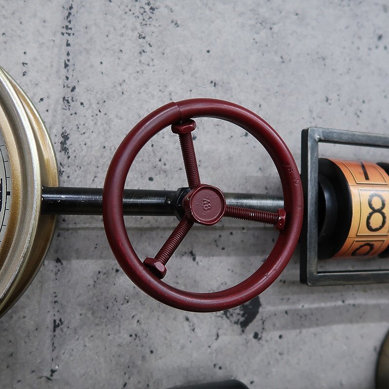 ボイラー室のスチーム管やスチームメーターなどスチームパンクなモチーフのウォールクロック。