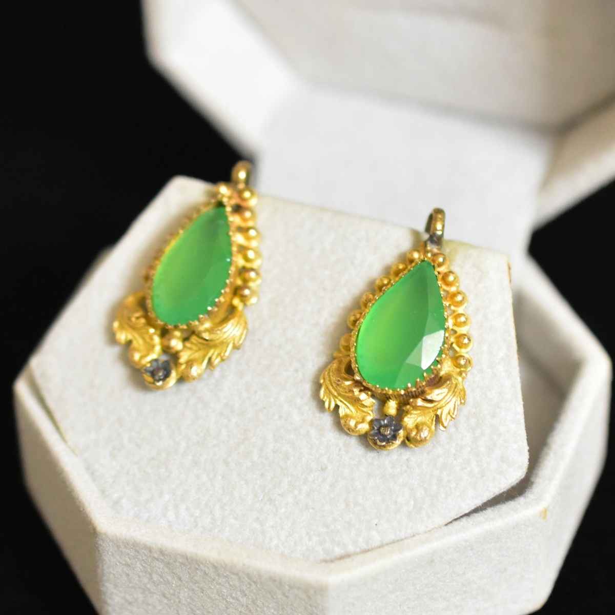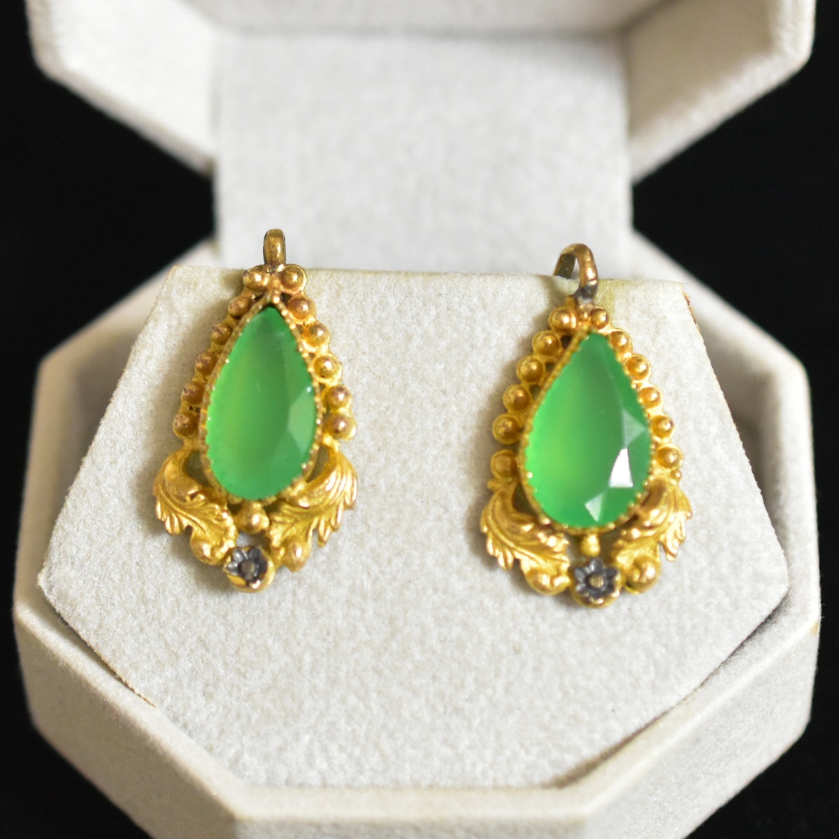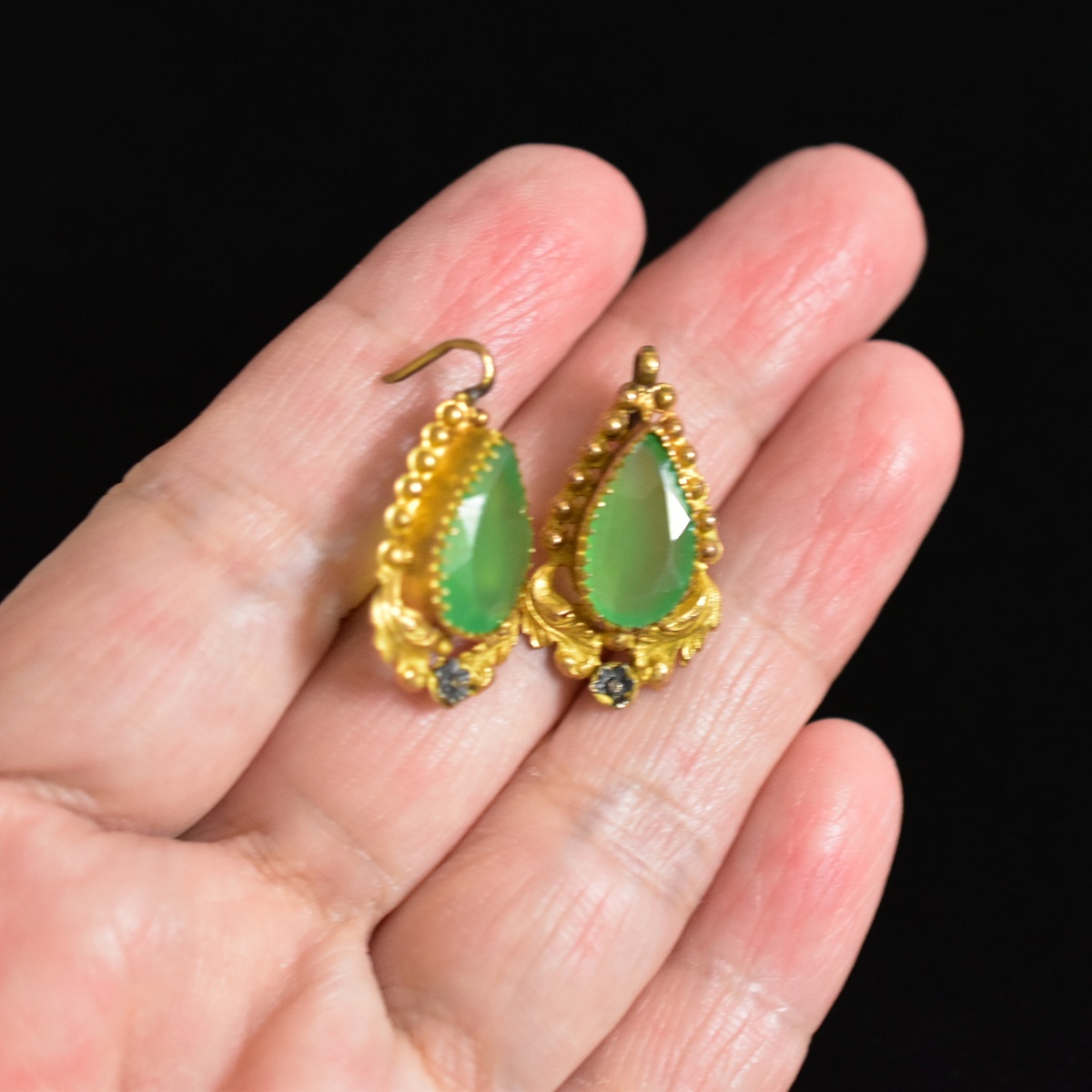 ジョージアン アンティーク 爽やかなグリーンの古ガラスのピアス 彫金細工 本物保証 ※ピアス部分かなり短めです※