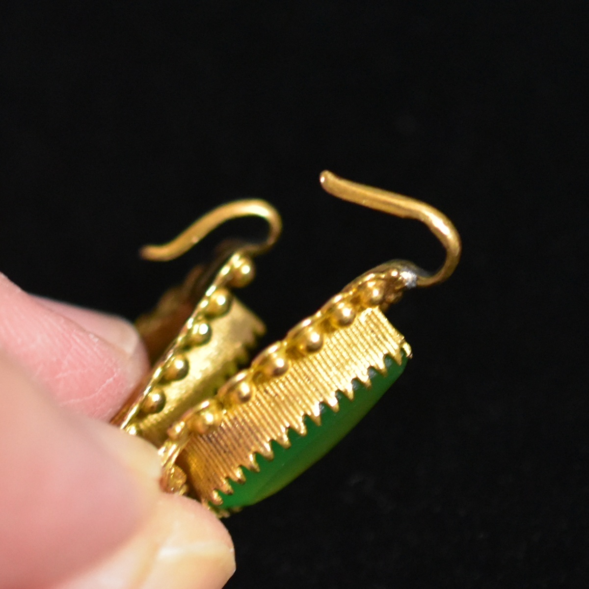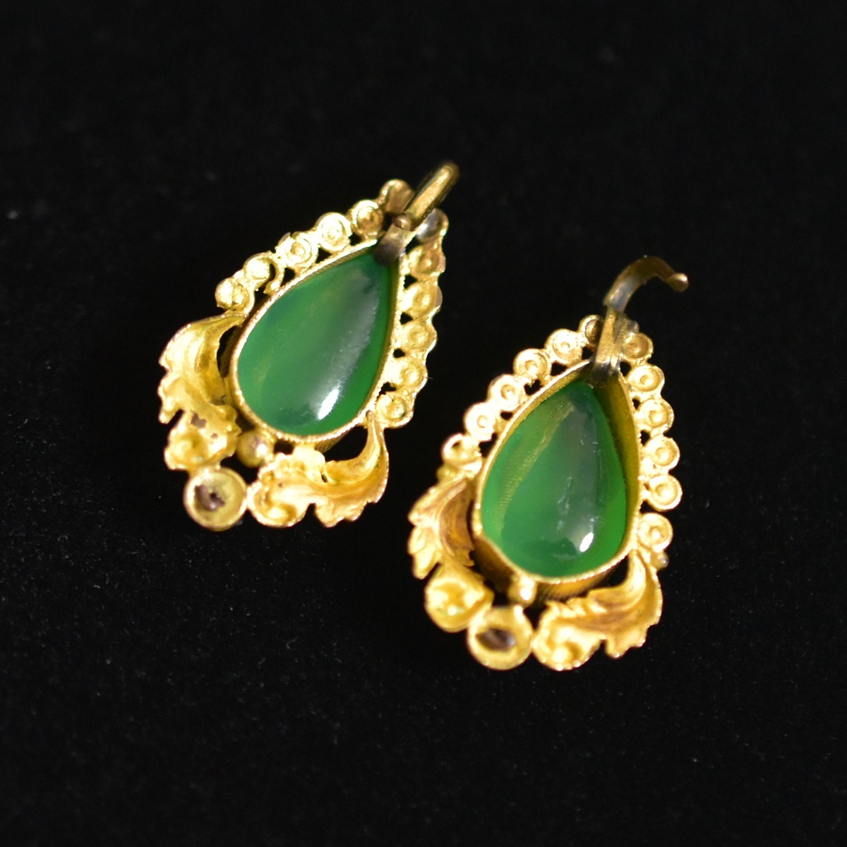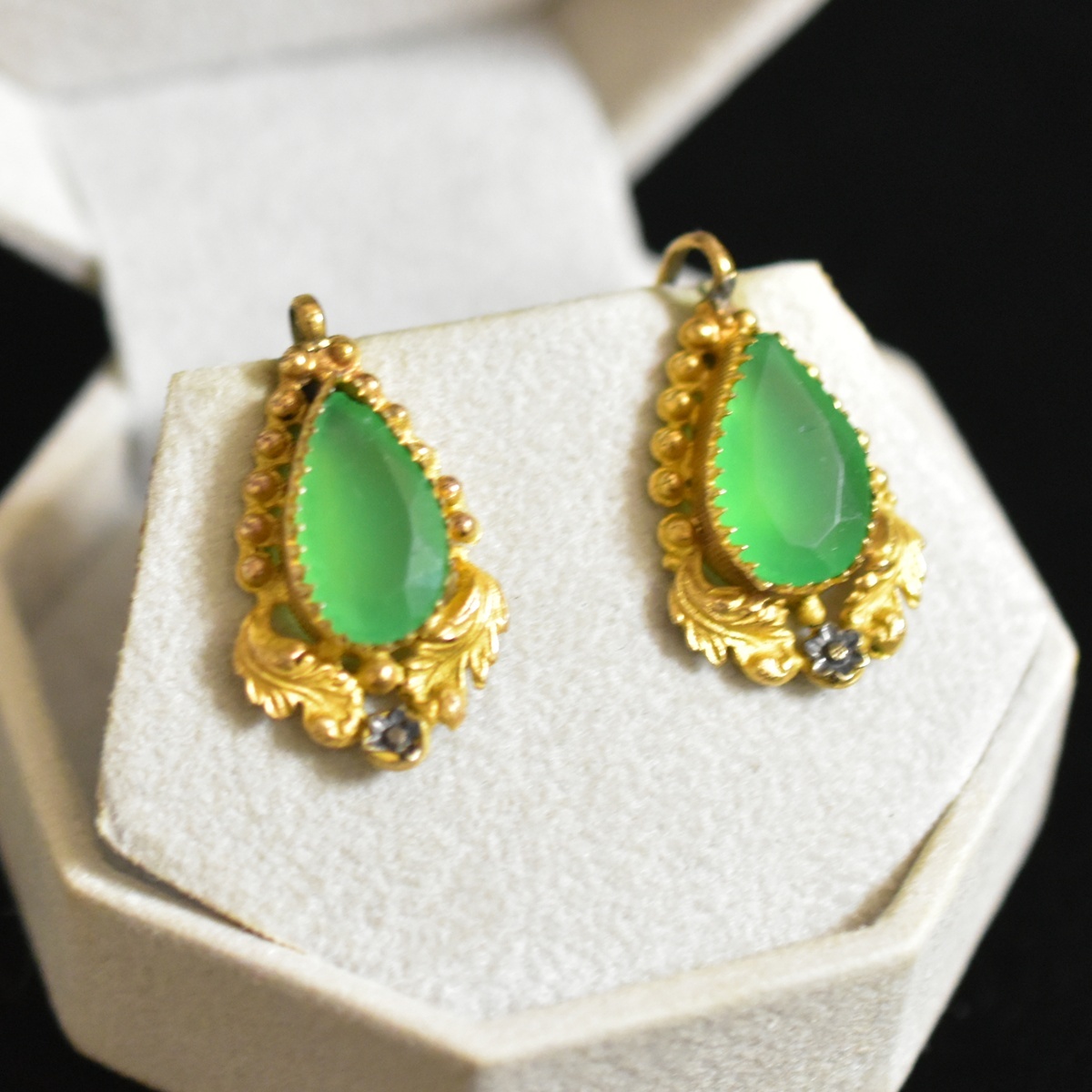 ジョージアン アンティーク 爽やかなグリーンの古ガラスのピアス 彫金細工 本物保証 ※ピアス部分かなり短めです※