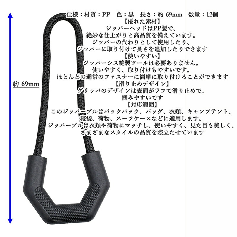 Product name: 【12個セット】ジッパープル ジッパータブ ファスナー 引き手 交換用ジッパープル 引きやすい 大きめザック ブラック