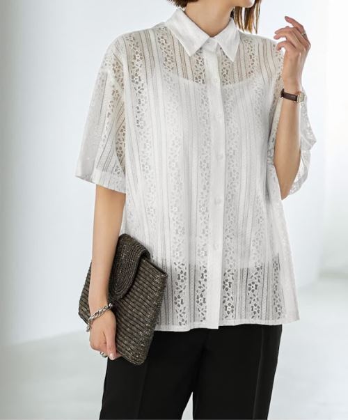 ◆ジャケットやカーディガン以外の羽織りものが欲しい方にもピッタリな、レース生地の半袖(5分袖)シャツ。とても涼しいため冷房除けの効果はありませんが、二の腕隠しや腹部のカバーなどに加え、着こなしとして何かを羽織りたい場合には適役です。