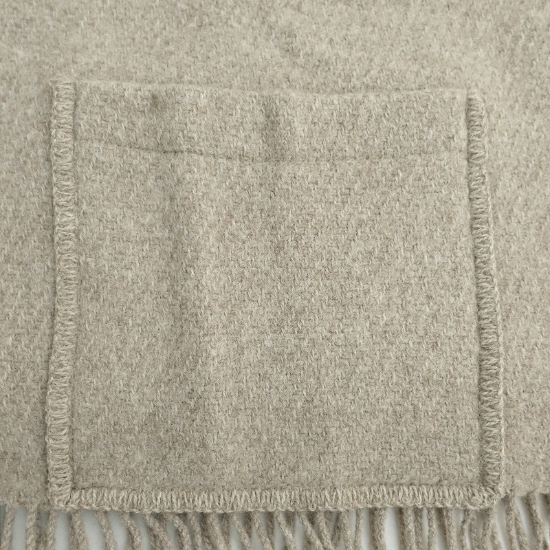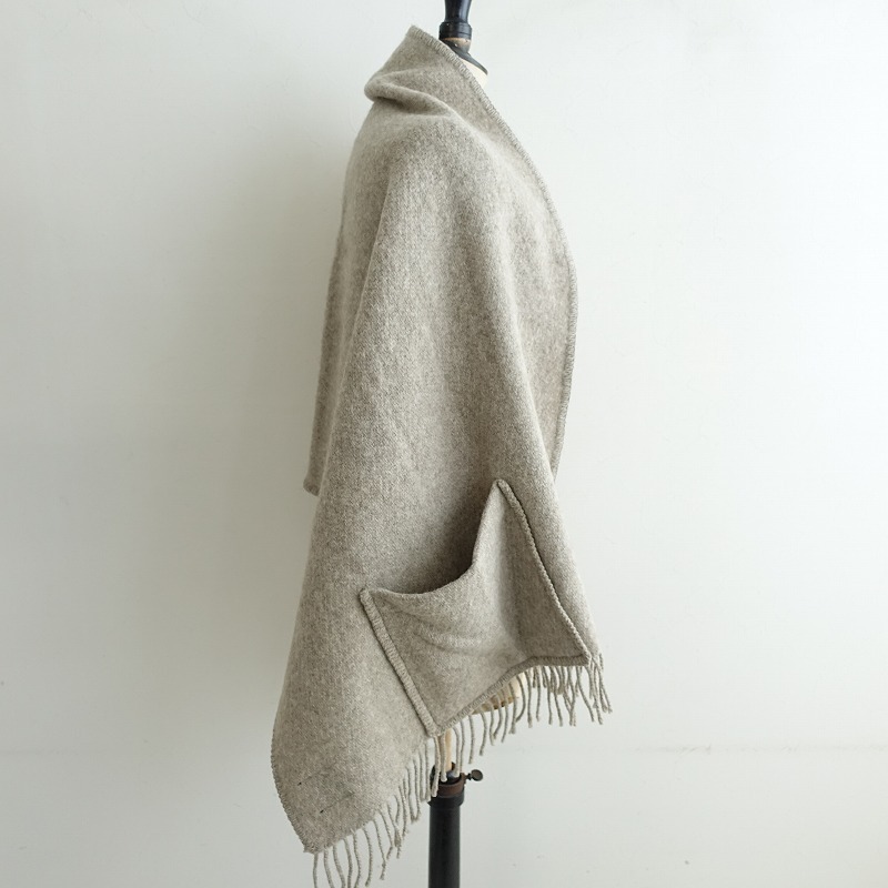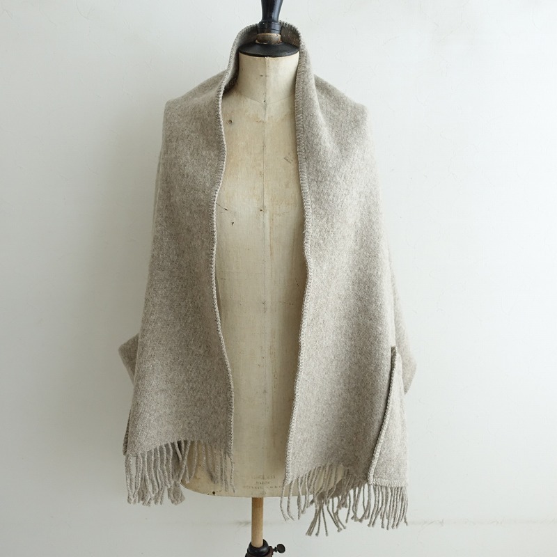 LAPUAN KANKURITのショールウィズポケットです。カラーはグレーベージュ系で素材は毛100%、両サイドフリンジ仕様で、両端に大きなポケットが付いています。