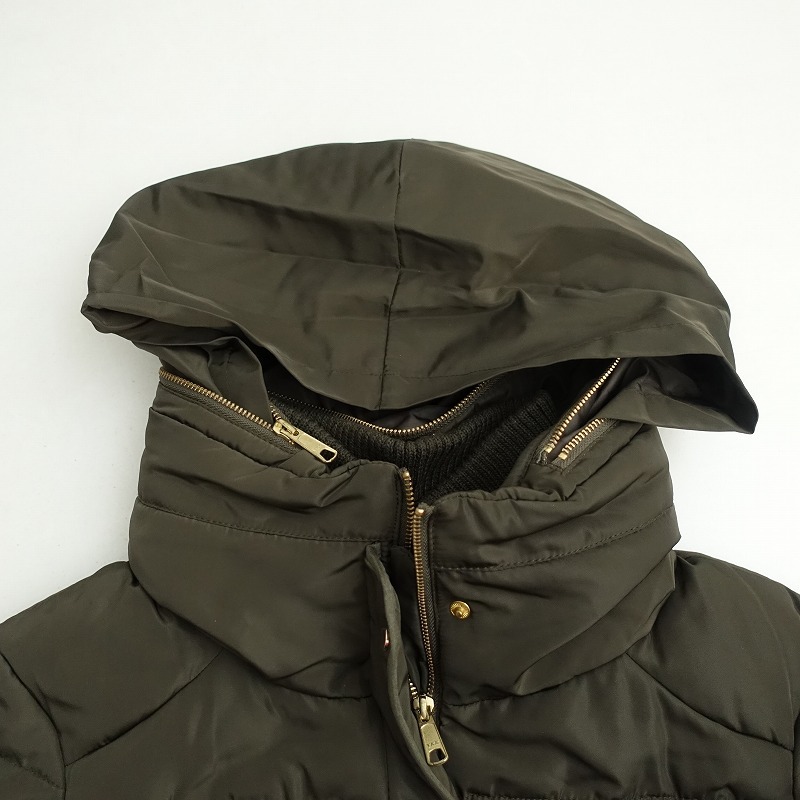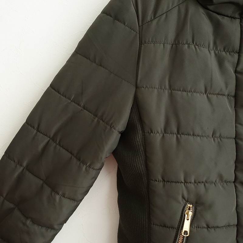 LAURA ASHLEYの中綿入りリブ切替えジャケットです。カラーはダークグリーンです。艶のあるポリエステルのタフタ生地を使った、中綿入りのキルティングジャケットです。レイヤード風にあしらわれたハイネックと袖口、脇サイド部分はリブニットを配し、襟にはフードが収納され、フロントのジッパー&ボタンの二重構造など防寒性に優れたジャケットです。前両腰にジップポケットがございます。