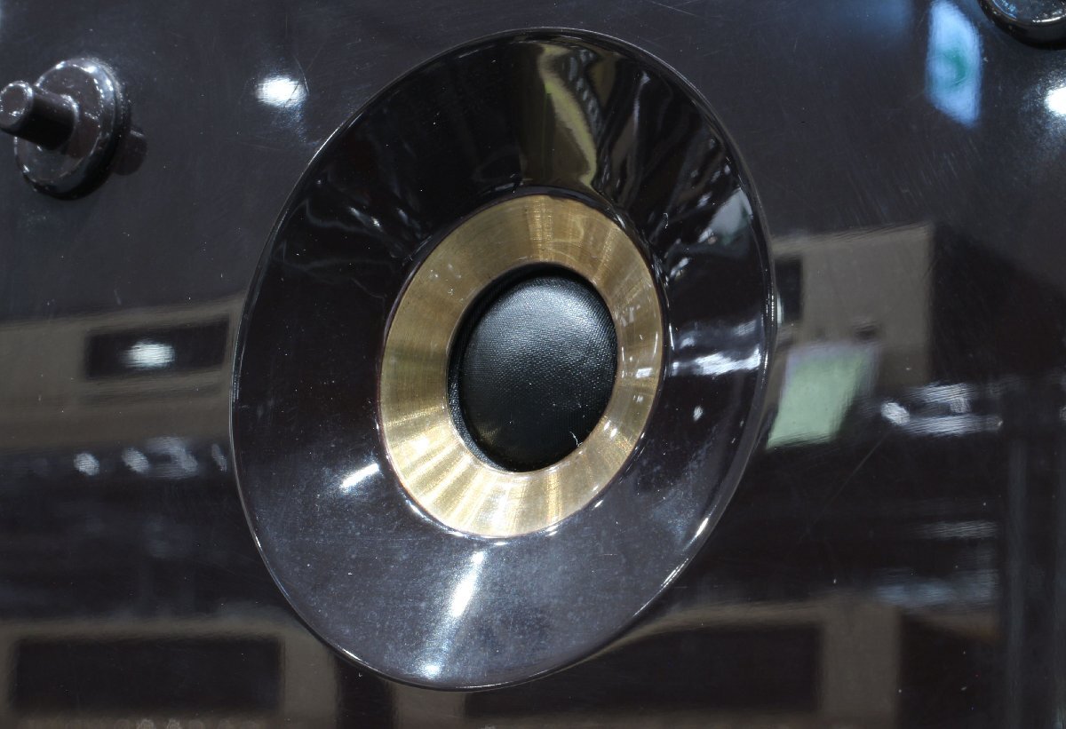 マホガニー無垢材キャビネットと真鍮ダイキャストボードによるユニフレームバッフルボードなどの新技術を投入して作られたスピーカーシステム