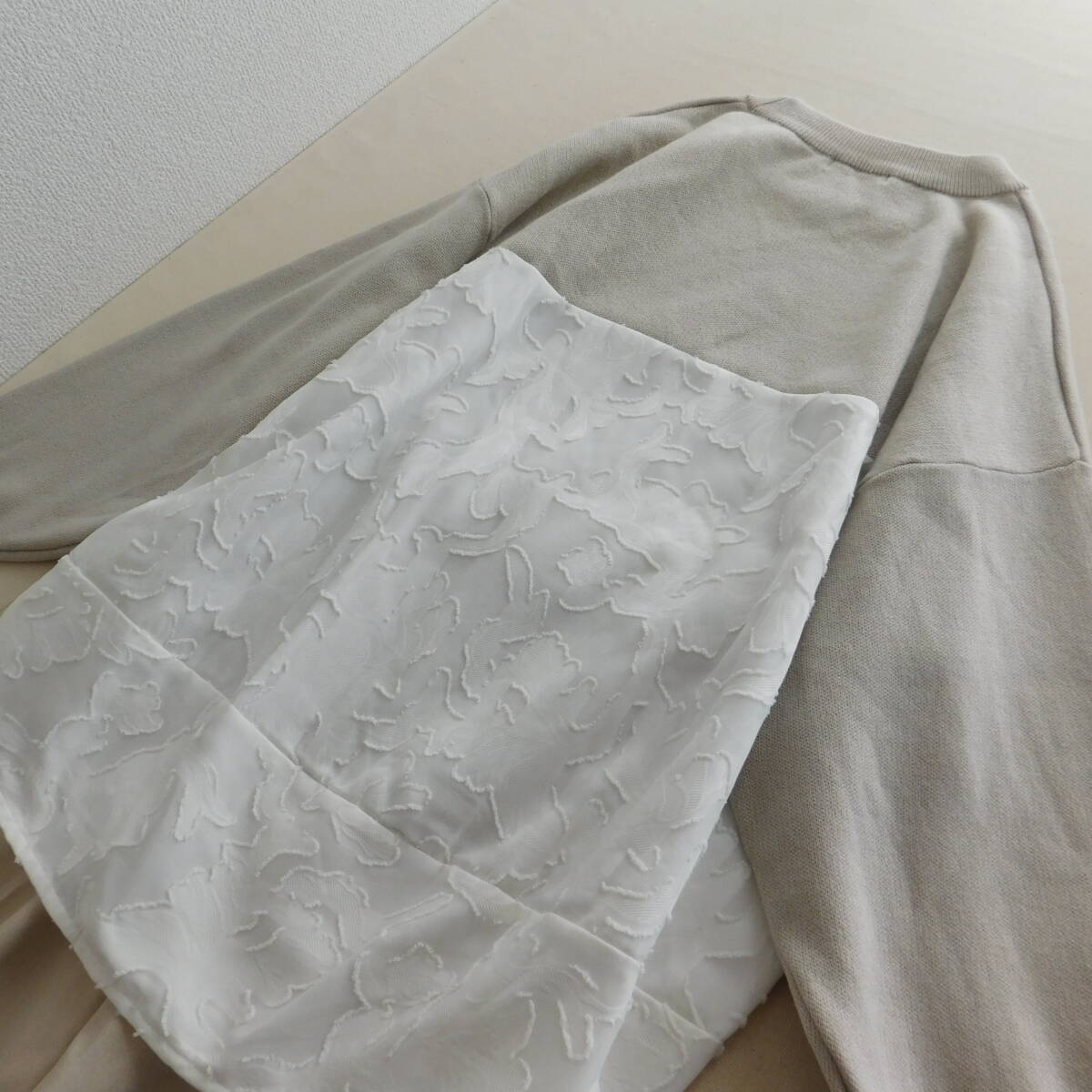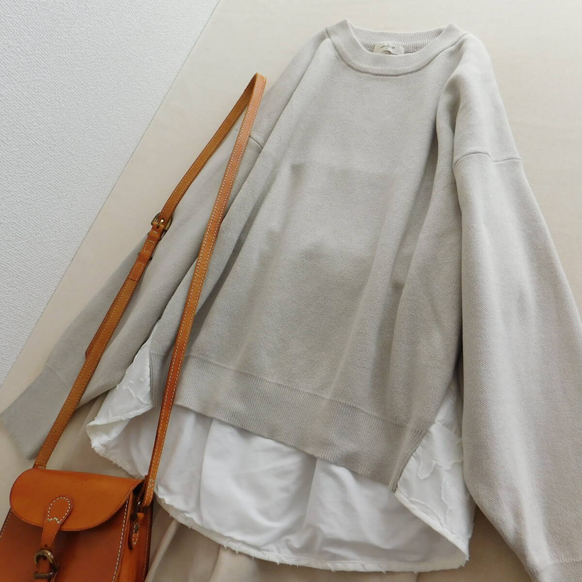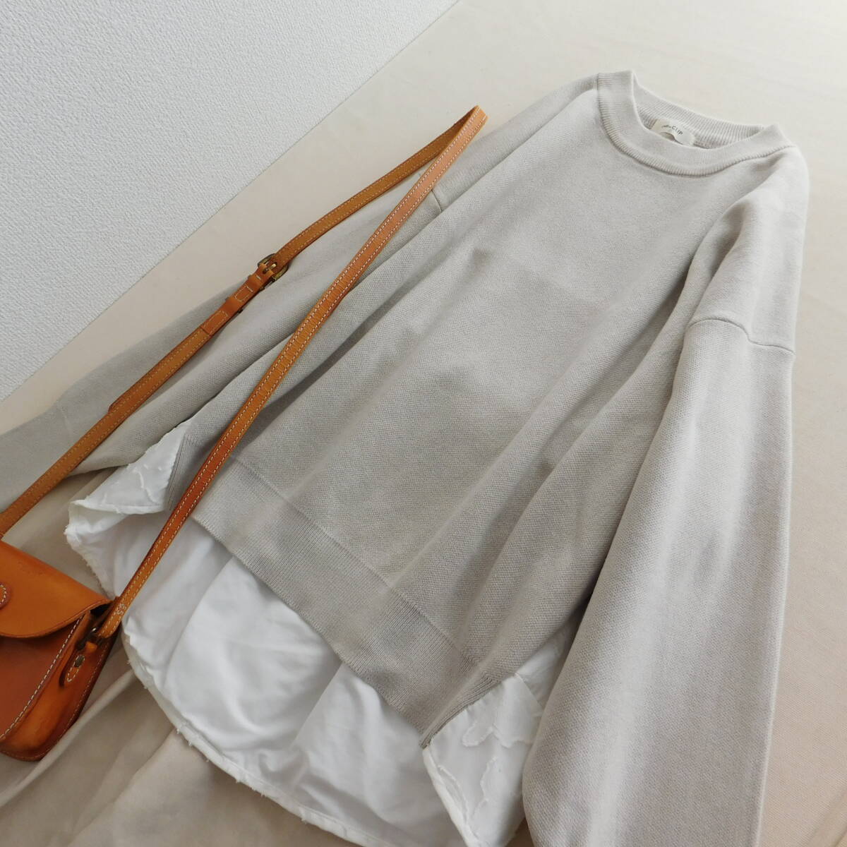 アイボリーベージュカラーの切り替えニットがかわいいです。