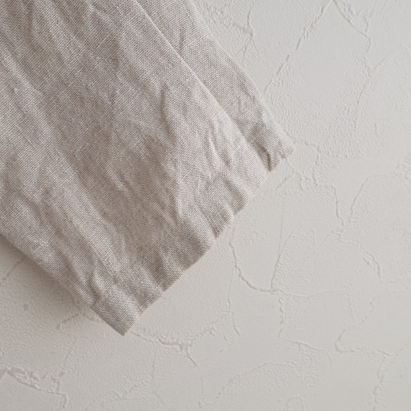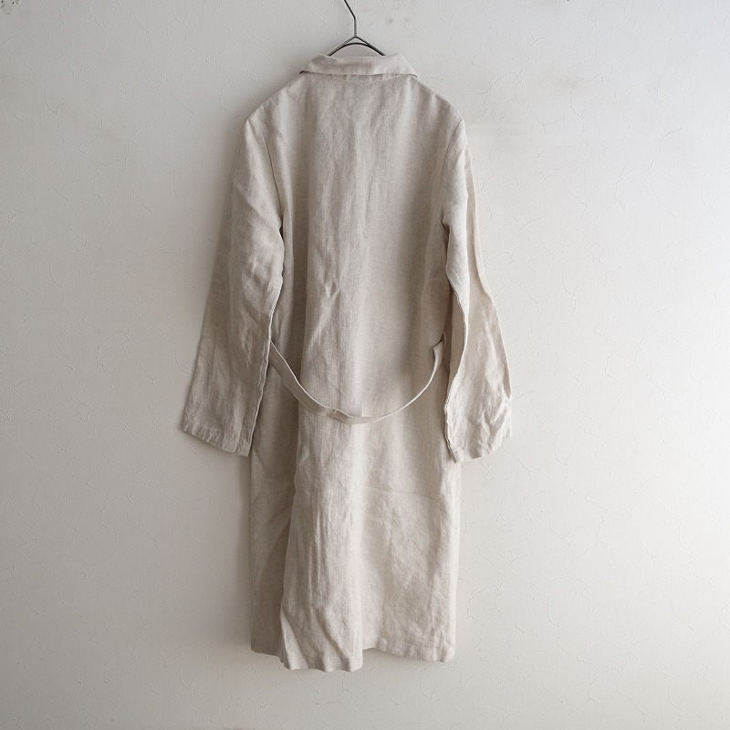 agnes b.のリネンステンカラーライトコートです。カラーはナチュラルベージュで、リネン地で仕立てられています。フロントはボタン開閉で、両サイドにポケット、共布のベルトひもが附属しております。