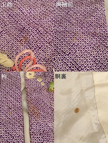 着物【正絹】の状態は接写画像のように上前・両袖前・衿・胴裏に汚れがございますが