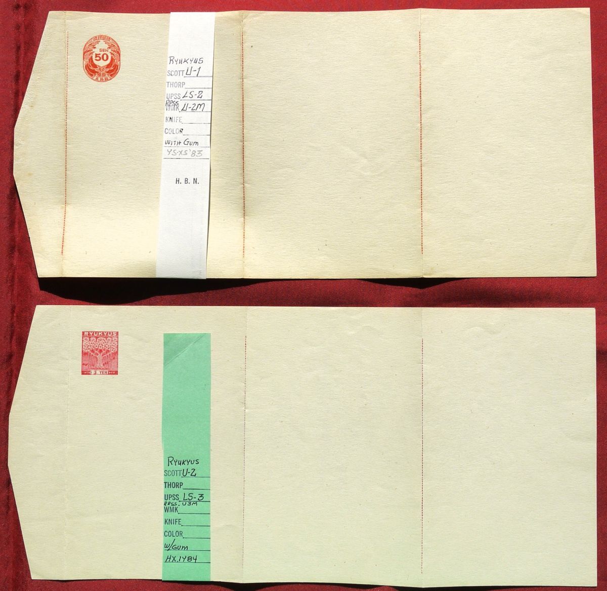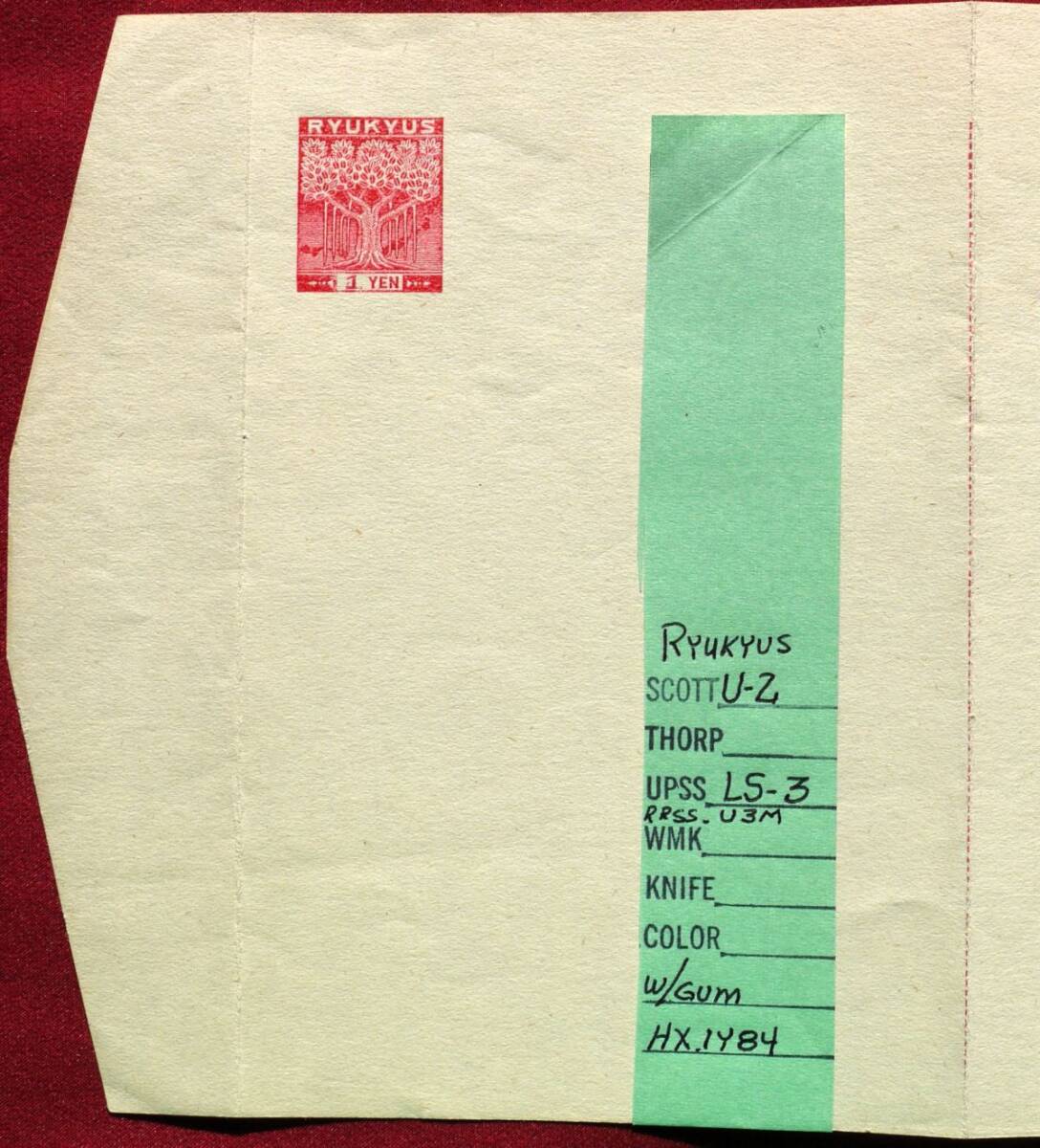 琉球官葉を出品します。米国コレクター収集品の放出里帰りで、米国にて長期保存、状態は良好なものが揃っています。多くの品にはスコット、UPSS(おそらく米国郵趣会)、RPSS(米国郵趣協会琉球専門部会)の各カタログ番号、葉書の説明などを記載した帯が付いており、コレクターが丁寧に整理したものと思われます。個々の状態は画像で良くご確認ください。出品に関る表記および型価は沖縄切手総カタログ増補版2022年発行または日専カタログ日本関連地域編2012年版によりますが、さらに詳細な区分、バラエティ、定常変種などはRPSS(米国郵趣協会琉球専門部会)発行の専門カタログ、モノグラフ、会報掲載の記事などによります。