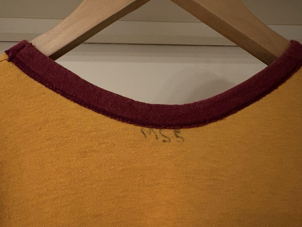 使用感があり、色褪せ、プリントひび割れ、ピンホール、落書きなどがございます。生地は肉厚でしっかりしております。40年以上前の衣料ですのでビンテージに理解がある方のみご検討宜しくお願いします。