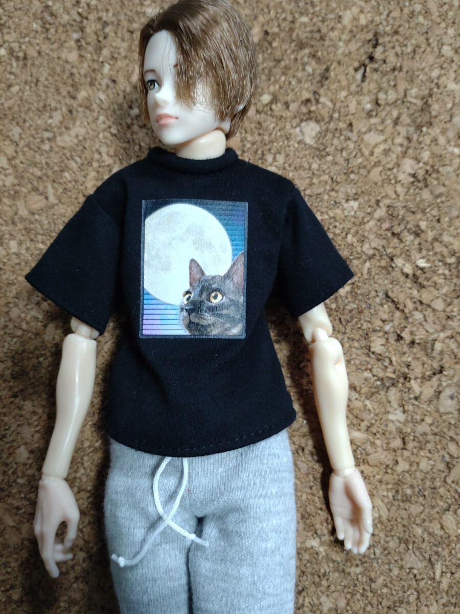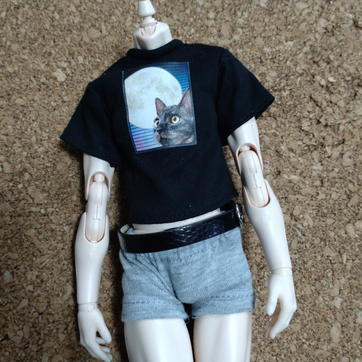 何年か前にアゾン購入しました。1/6サイズの月と猫Tシャツです。モデルは六分の一男子図鑑のエイトとオビツの30センチボディです。モデルの人形はつきません、Tシャツだけです。開封後エイトに着せたりしていましたが、まだまだキレイな感じだと思います。
