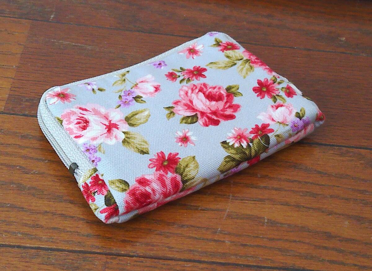 ファスナーカードケース★グレー地赤ピンク系バラ花葉っぱ