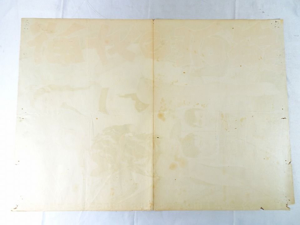 経年によるヤケ、破れ、鋲跡、折れあり。裏面にシミあり。丸めず梱包または折り跡あるものは折って発送いたします。