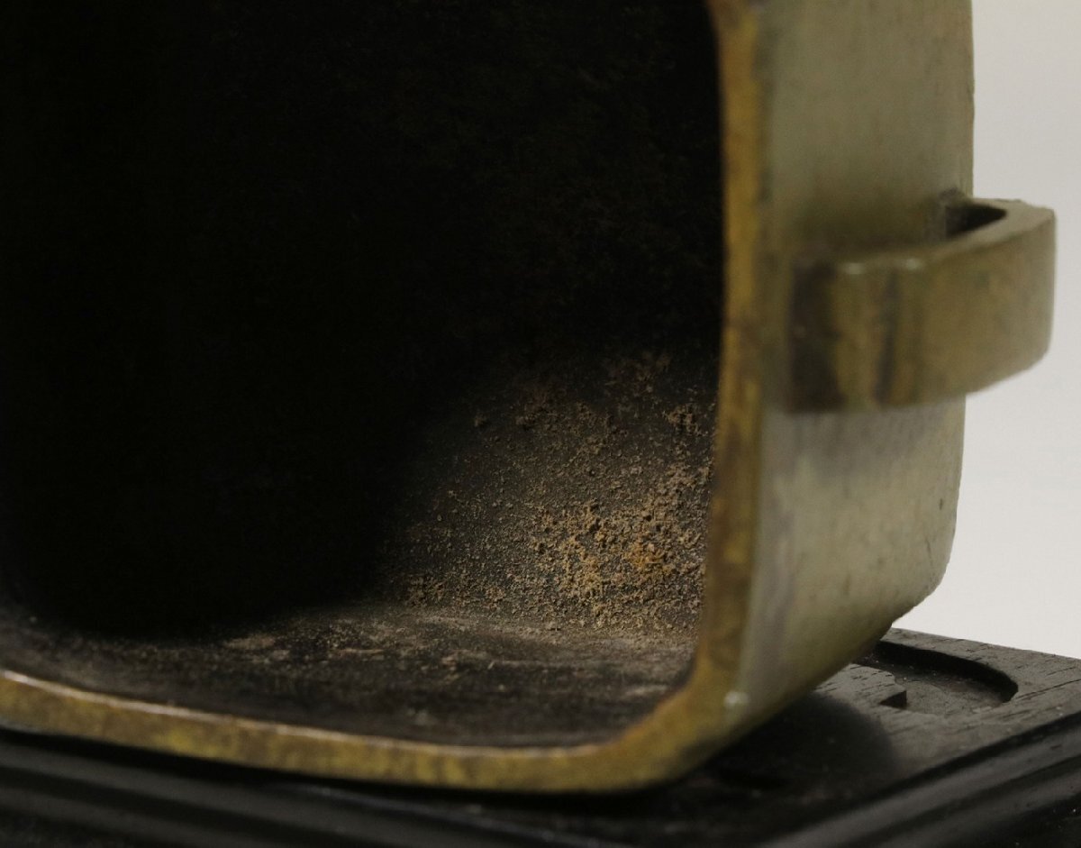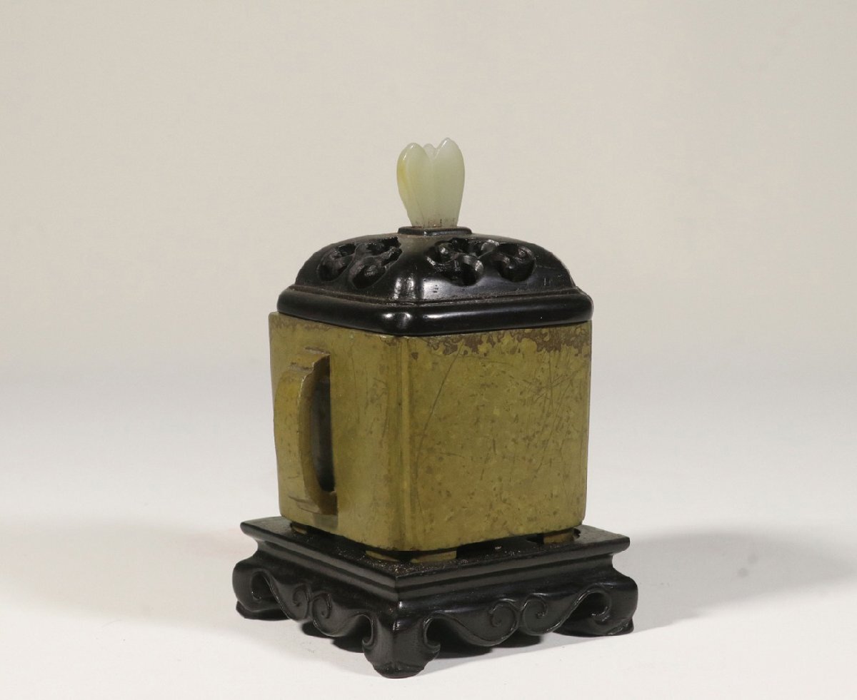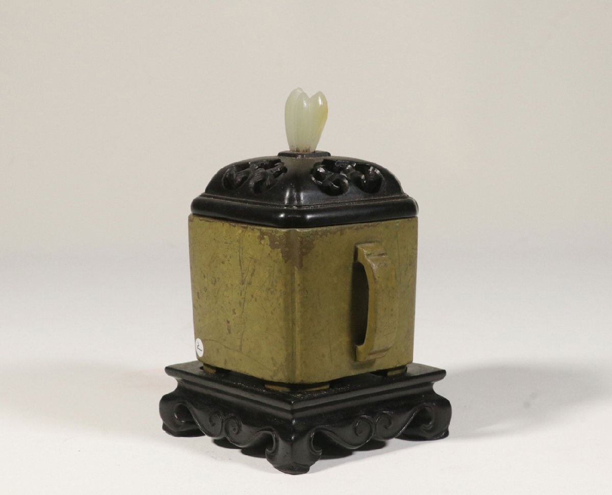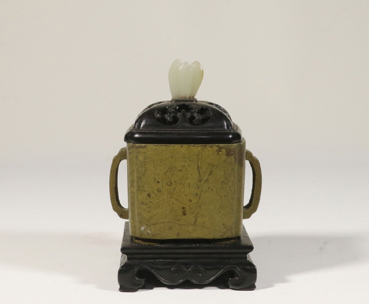 Product name: 【安】明時代 在銘 銅胎施金 双耳四方香薫炉 和田玉摘鈕 紫檀木蓋台 極細工 古置物 中国古美術 時代物 古董品 221