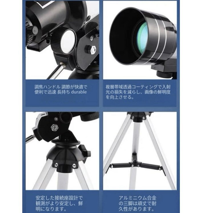 焦点距離300mm、有効口径70mmで、最大150倍、優れた集光力と広い視野を提供します。そして、観察したい天体の本来の色を歪めることなく再現することができ、まるでその場にいるかのような臨場感を味わうことができます。素晴らしい天体観測の体験を!宇宙を探求する子供・大人・天文初心者の方への天文ギフトにおすすめです。