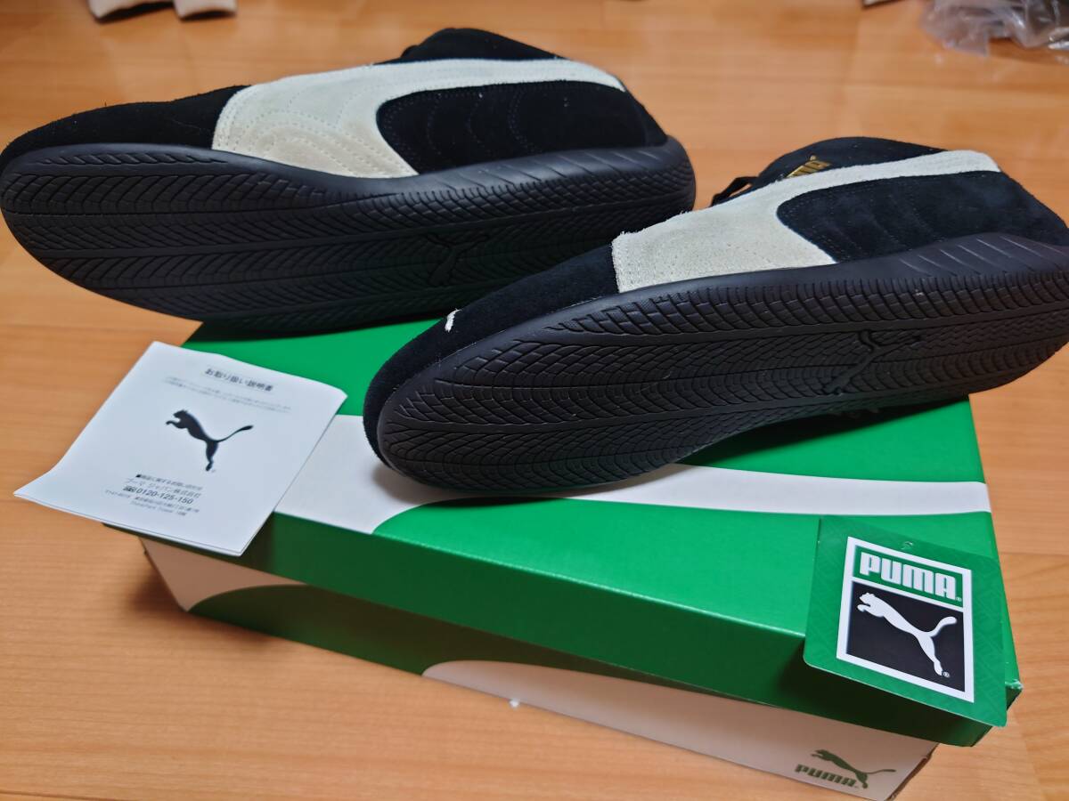 PUMAのドライビングシューズ「スピードキャットOG」です。室内での試着のみの状態で購入し、30分ほどクルマの運転時に履いただけの物になります。臭い等もなく、新品同様です。色は黒に白ラインになります。スウェード本革仕様です。当方普段はナイキのスニーカーだと27.5cmがちょうどよいのですが、本品は少し大きく、ナイキの28cmを履かれている方にジャストサイズかと思います。現在は別売りのゴム紐に交換していますが、オリジナルの紐も付属します。サイズが合わない等の返品はお断りします。
