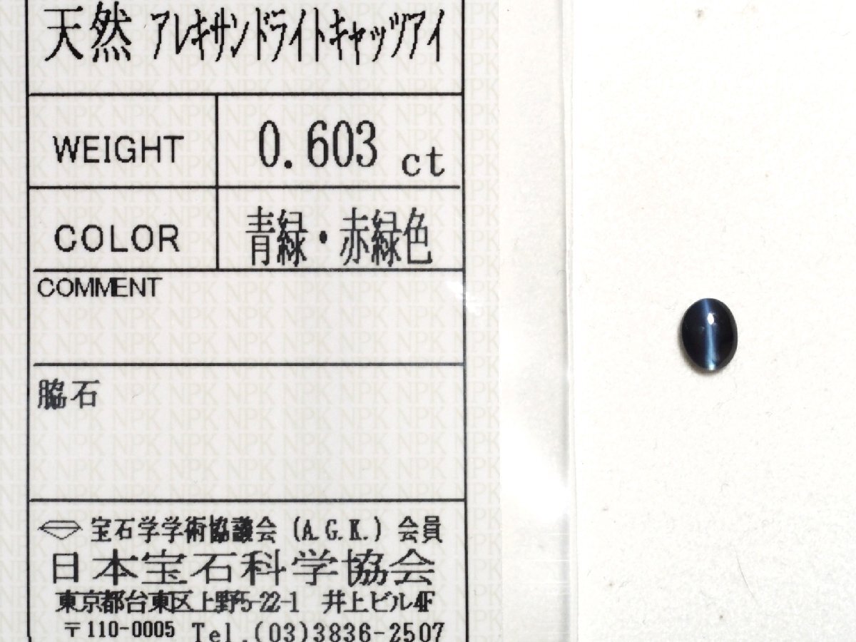 Product name: 天然アレキサンドライトキャッツアイ ルース 0.603 ct、ソーティング付、ケース入り