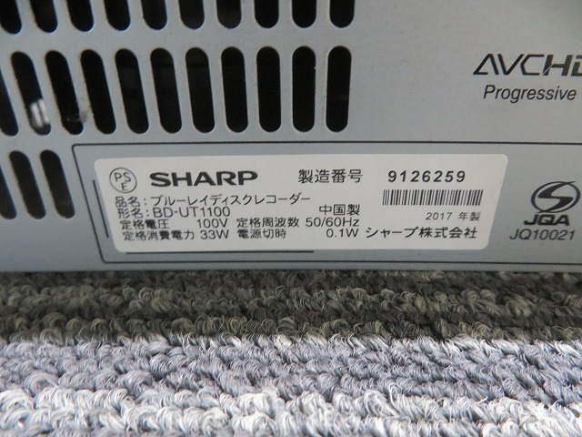 J☆SHARP シャープ BD-UT1100 ブルーレイレコーダー 2017年製 B-CAS付 ◎通電OK ◎再生など簡易動作確認済