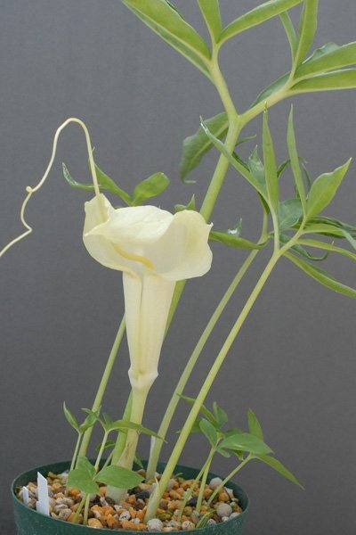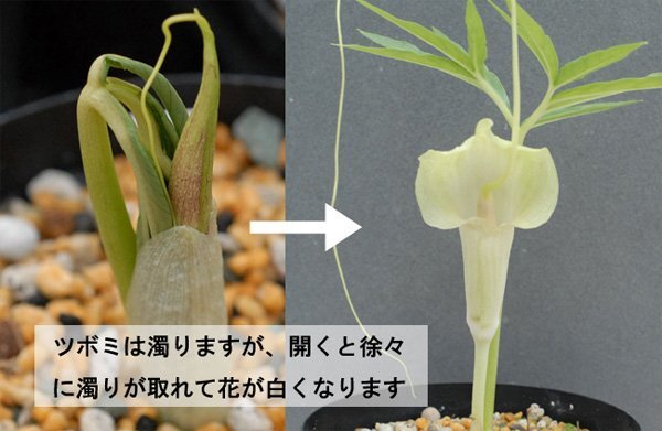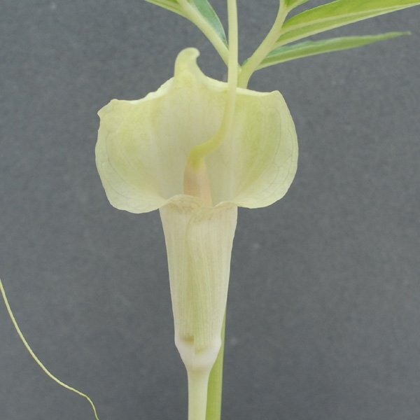 産地は分かりません。一見、素心に見えますが、仏炎包の裏側や芽出しの袴が極わずかに色づきますので、素心ではありません。通常の素心ウラシマソウと比べてもかなり白っぽいです。