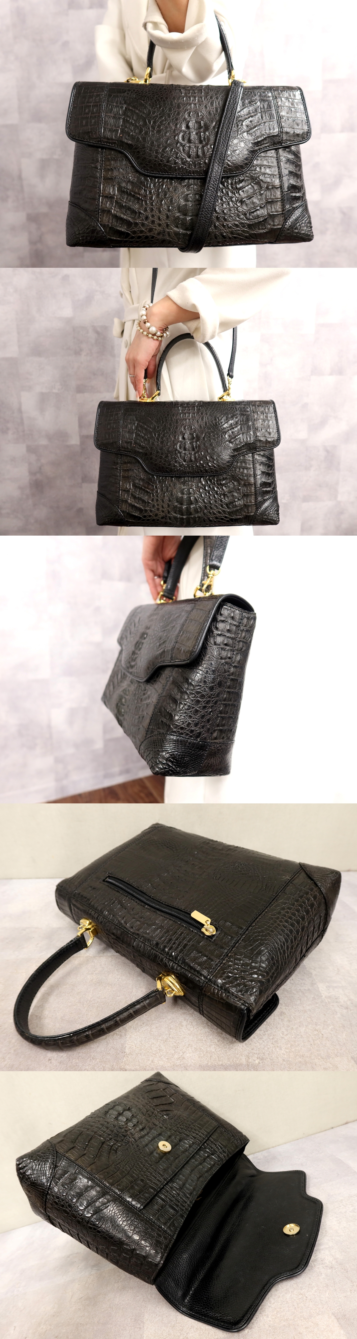 Product name: ●超美品●GENUINE●フラップ●クロコダイル 本 ワニ 革●2way ハンド バッグ●黒●ゴールド金具●腕掛け●B5 書類 収納 かばん●Js65679