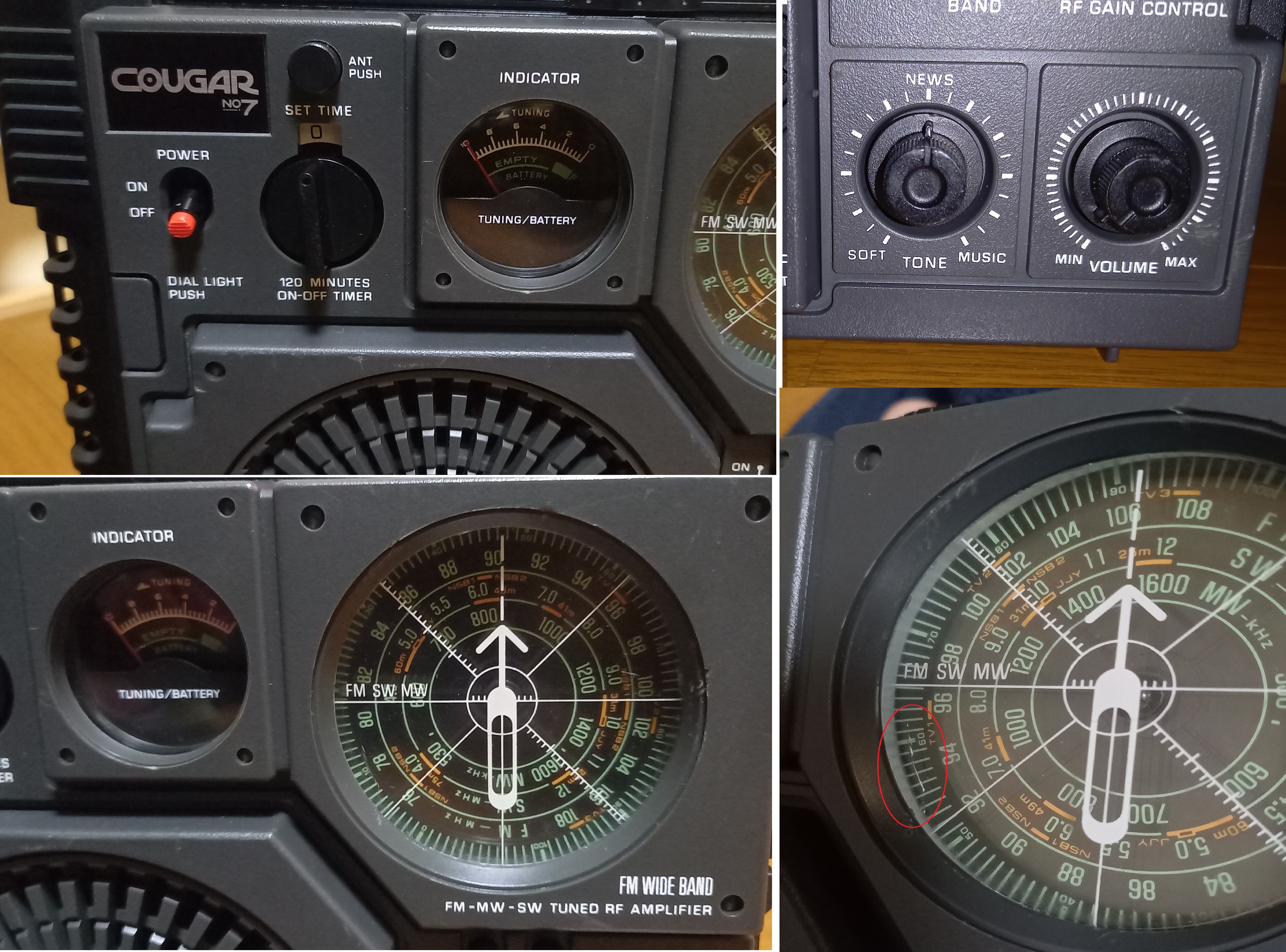 ロッドアンテナは折損のため、別のエレメントで補修しましたので、 標準よりも短くなっています。 ジャイロアンテナはポップアップし、カチカチとスムーズに動きます。 ダイヤルライトも点灯します(写真7枚目は5MhzのBMP(中国の標準電波)を受信中のもの)。 タイマーも動作しています。 電池での使用に問題はありません。なお、電池蓋のスポンジは不燃性スポンジで張り替えてあります。