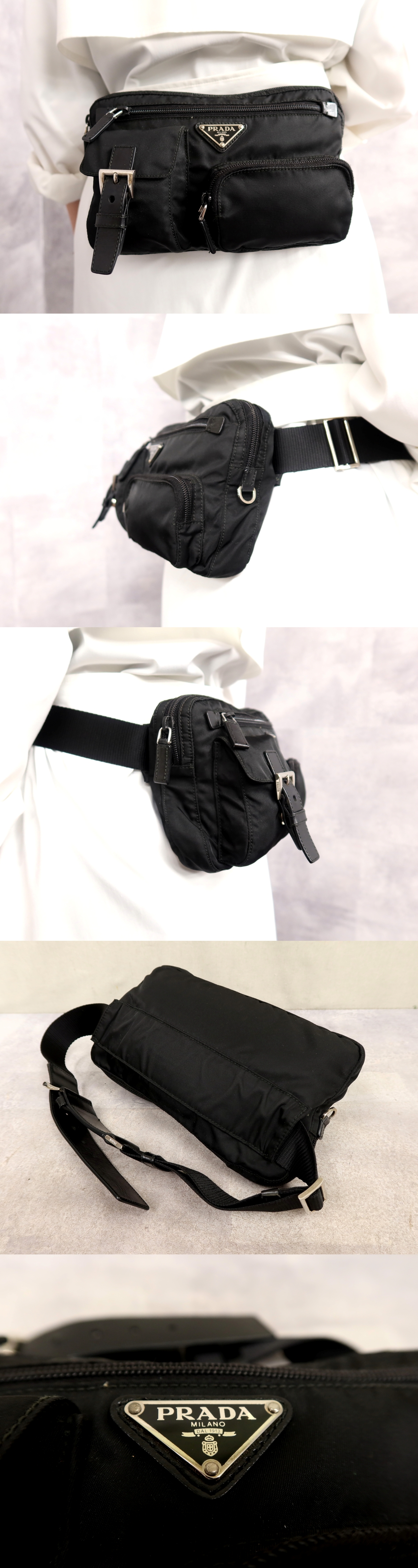 Store ●超美品●PRADA プラダ●三角ロゴプレート●ポコノ ナイロン カーフ レザー 本革●ウエスト バッグ●黒●シルバー金具●かばん●Js67133