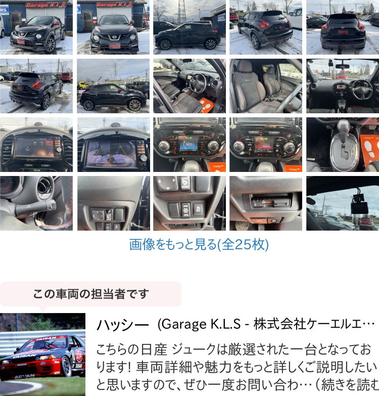 日産 ジュークはいかがでしょうか。平成25年式で走行距離は132200kmですが、修復歴がなく保証付きです。注目のブラックSUVは、ABSやバックカメラ、ETCを装備。さらにBluetooth対応ナビとドライブレコーダーも完備されています。夏冬タイヤ付きで季節を問わず快適にドライブを楽しめます。信頼性と利便性を兼ね備えたこの一台をお見逃しなく!