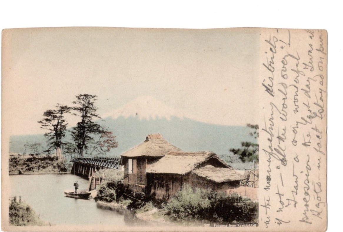 ◆ 手彩色 富士山 静岡 河合橋 手前に民家 船