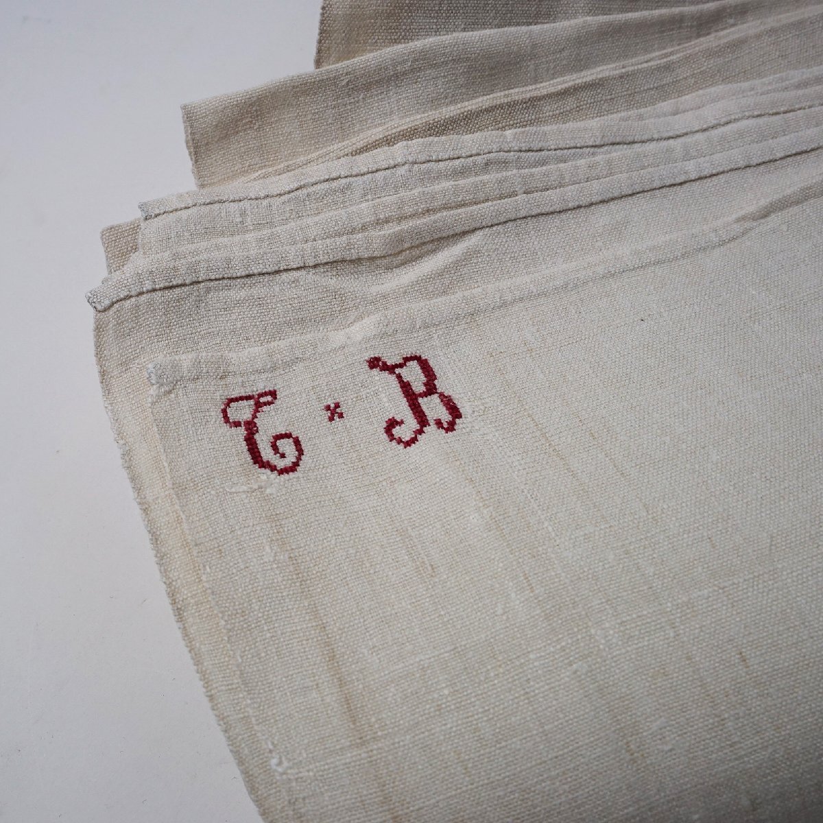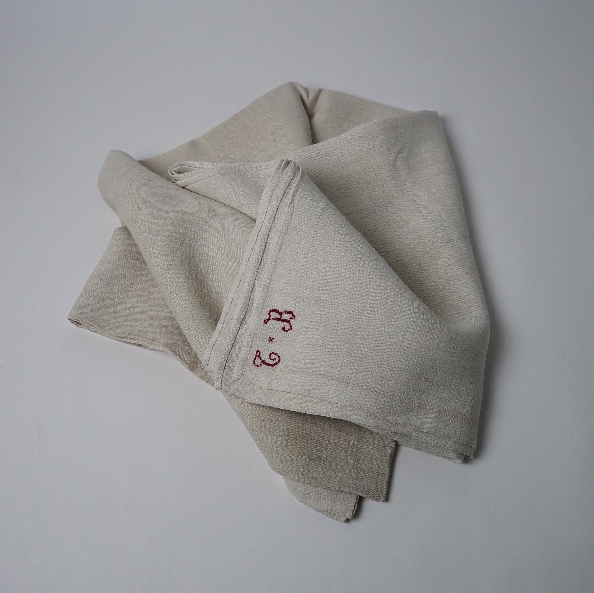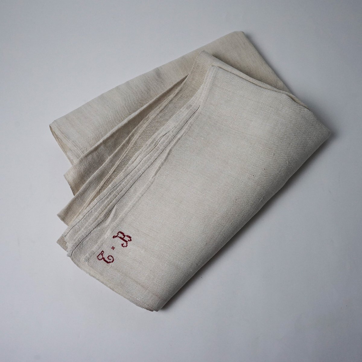 ○素材:フランスアンティーク 手織りシャンブルリネンのシーツです。織り幅の狭い織り機で織らているので2枚を接いで出来ています。フチなど丁寧に手縫いで仕上げられています。裾に赤いイニシャルの刺繍があります。フランス購入品です。