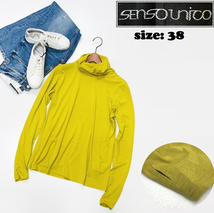 【38】Sensounico イエロー 長袖カットソー タートルネック レディース カジュアル通勤大人可愛い個性的生地ストレッチマツオ センソユニコ