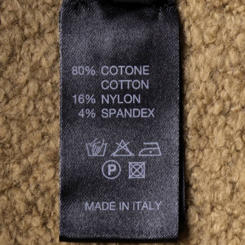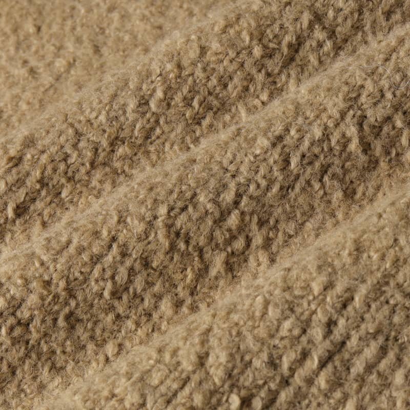 ・コットン、ナイロン、スパンデックスの三者混素材を使用した、フワッとソフトで暖かみのあるブークレ調のミドルゲージニット。