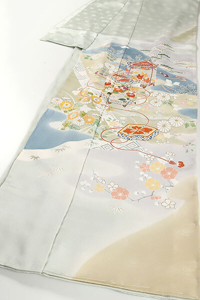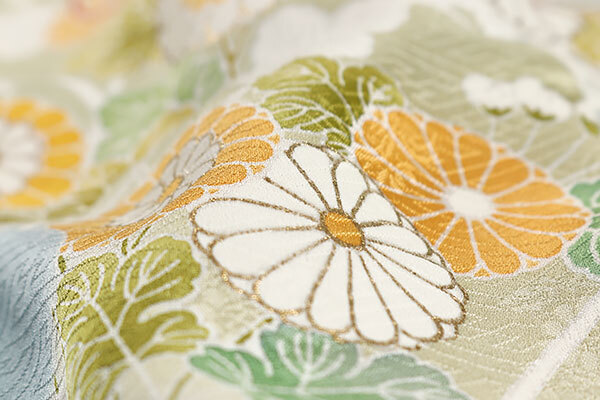 紗綾形に蘭と菊をあしらった本紋の地紋入りの上質な生地は、白緑色の上品なお色目で、やや光沢感がございます。