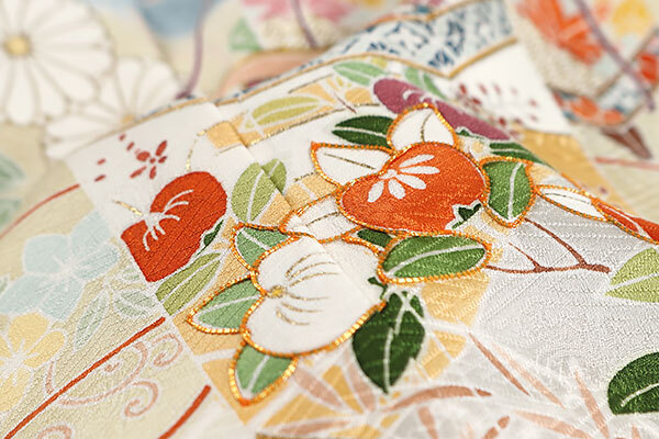 橘や紅葉、菊などがあしらわれた貝桶文が染められており、まわりには、菊や松、蔦などの文様が描かれており、華やかな印象でございます。