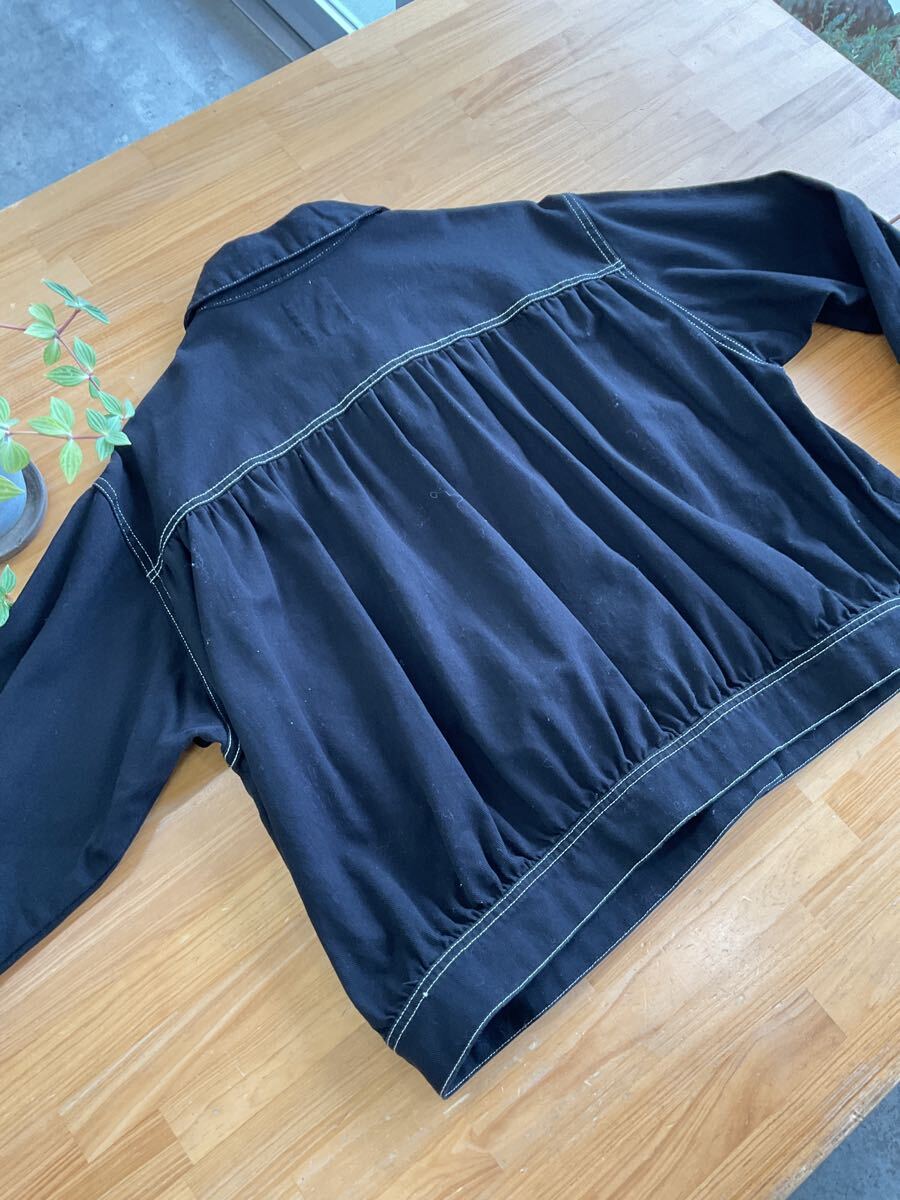 美品 AS KNOW AS アズノゥアズ ステッチデニムワイドショートジャケット ストレッチ素材ジーンズライトアウター ブラック黒色系 フリー