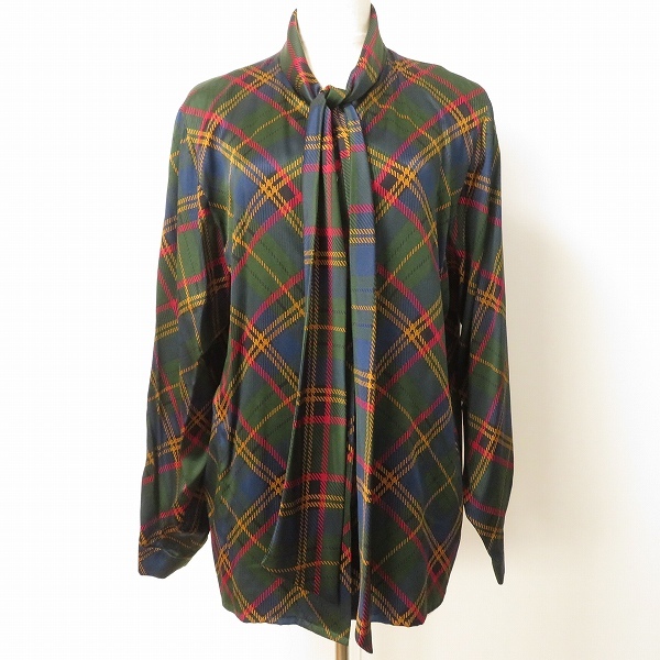 #anc イヴサンローラン Yves Saint Laurent シャツ ブラウス 36 緑 紺 赤 シルク チェック ボウタイ ヴィンテージ レディース [932877]