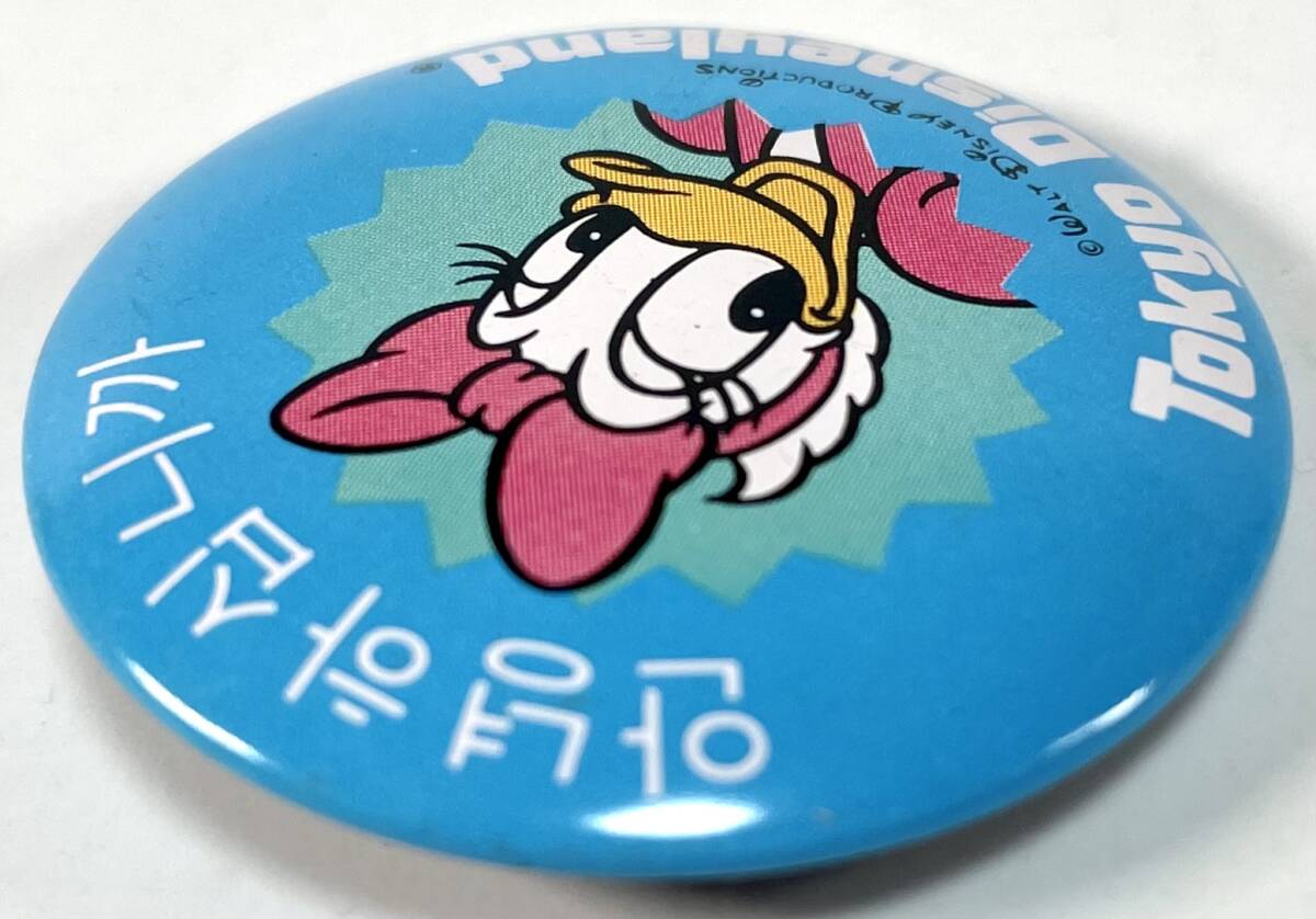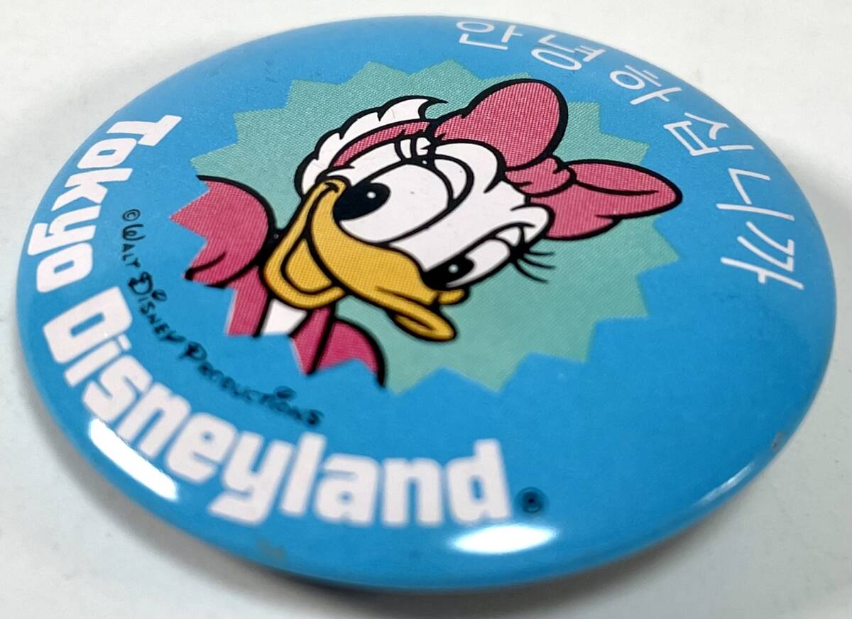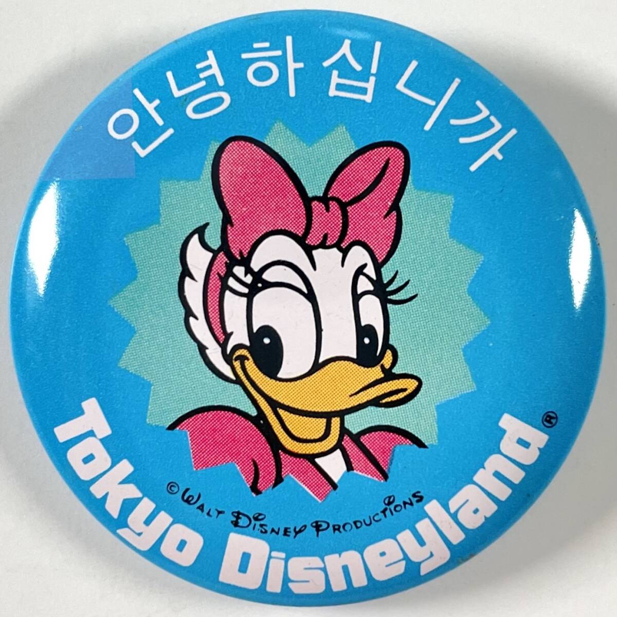 東京ディズニーランド「デイジーダック」韓国語挨拶缶バッジ(Tokyo Disneyland/アンニョンハシムニカ/1980年代?/レトロ/JUNK)