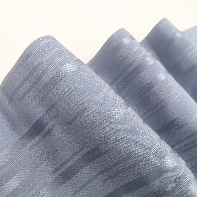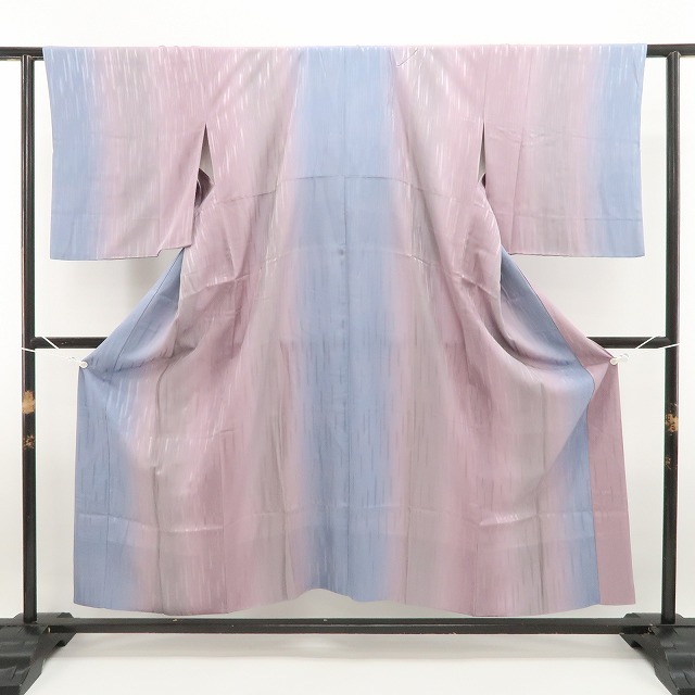 浅紫色と紺鼠色の濃淡に広がる丸みを帯びたおとな色の表情、縦状の構図で揺らぐ不統一なデザインライン、それは正に今をときめく創作着物の奥行そのもの、季節の装いをお洒落に演出するひと品…すっきりとしたフォルムと程良い艶感がとても素敵です。