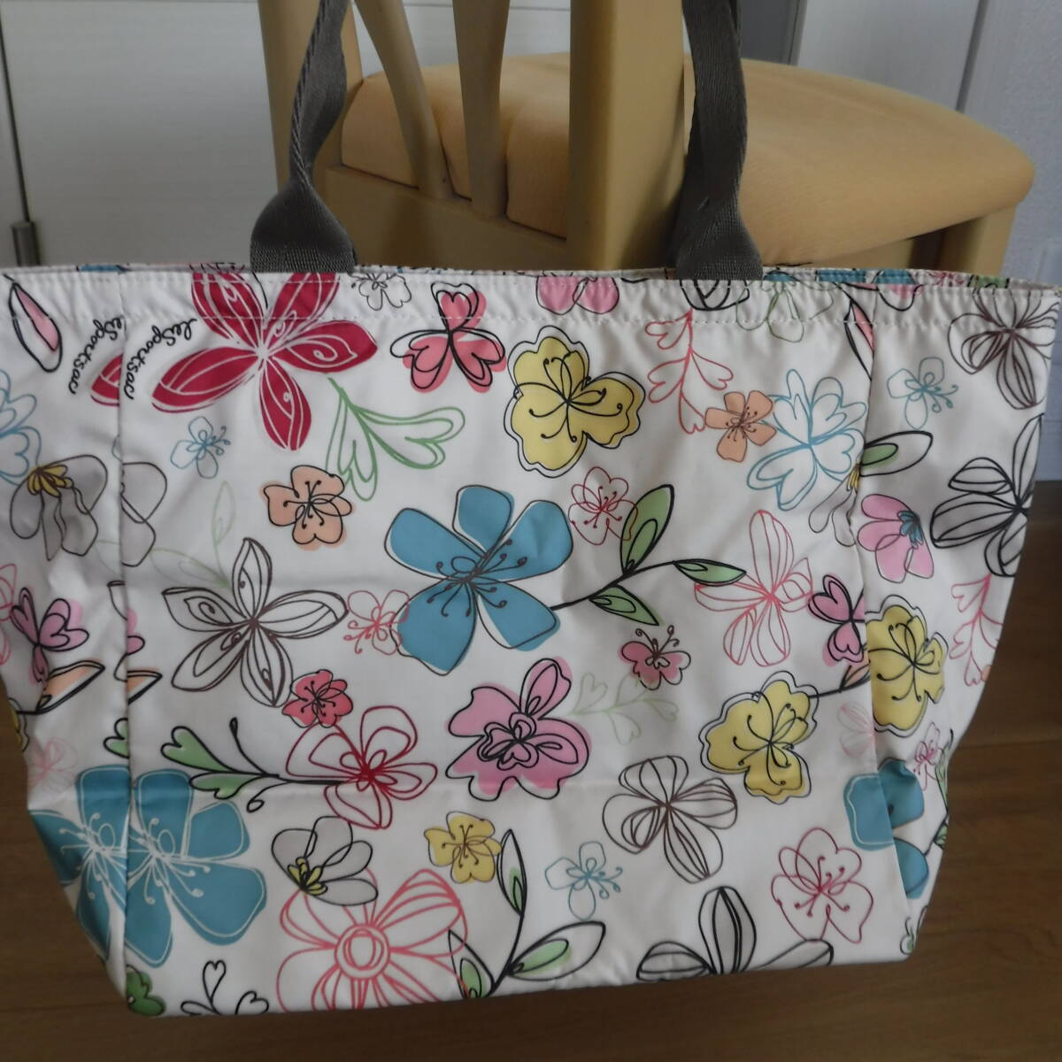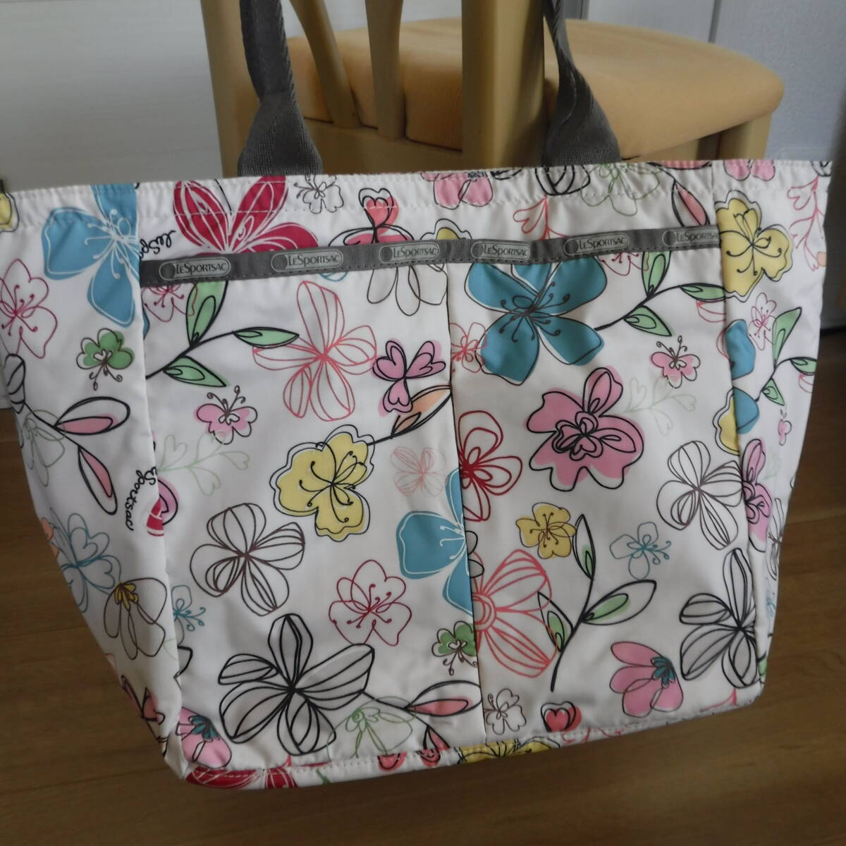 レスポートサックのハワイ・DFS限定ペーパーフラワーのトートバッグで、形はエブリガールトート、サイズは個人寸法で横46縦30マチ18持ち手53センチ位で人によりますが肩から掛けられると思います☆トップはチャック式、表面内側共にチャック式大きめポケットがあり、それ以外にもポーチがあるので使いやすいと思います♪持ち手は二重になっているので肩が痛くなりにくく、底面はクッション性があるので重いものを入れても型崩れしにくいと思います☆ペーパーフラワー柄は数年前にハワイのレスポートサックで販売されており、白地にカラフルなフラワー柄が可愛い柄ですが、今では製造販売していないはずですので、この状態での入手は困難かと思います。新品タグ・ポーチ付き未使用品ですが、個人保管につき、多少の汚れや擦れ、チャックのくすみや傷、シワなどある場合がありますので、ご理解ある方、ノークレームノーリターンでお願いします!