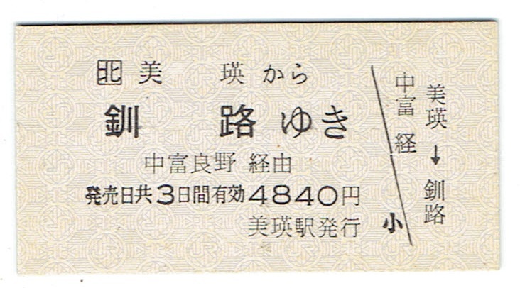 《JR硬券 乗車券》美瑛から釧路ゆき