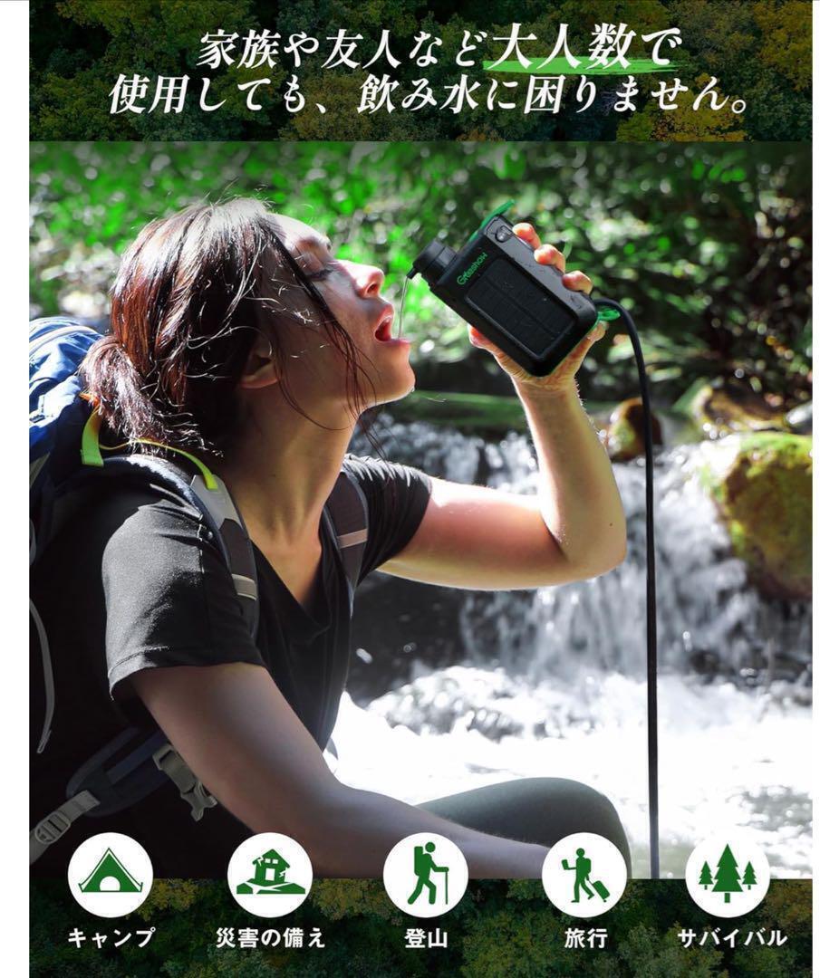 【業界最新のGS-2811電動浄水器は】GS-2811電動式携帯浄水器は、限外ろ過(UF:Ultrafiltration)を採用、5段階の浄水システム(中空糸膜フィルター+ KDFフィルター+高品質活性炭フィルター+レベルPPコットンと超高品質内蔵0.01ミクロン中空糸膜フィルター)があります。この製品は「移動可能な浄水場」の機能を果たし、濁った水でもろ過可能で、川や湖の水を飲用に適した清潔な水に変換します。ボタンを一度押すと、微粒子、赤錆、大腸菌、コレラ菌などの微生物や原虫嚢子、沈殿物などの不純物を効果的にろ過し、操作が簡単で便利になります。定期的なフィルター交換により、衛生的で安心な美味しい水を確保できます。ミネラルウォーターよりもコストパフォーマンスが高く、環境にも優しいです。
