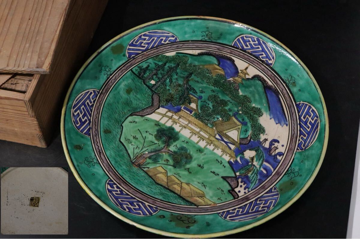 角福 紋 色絵 青手 山景図 大皿 共箱 / 九谷焼 茶器 皿 青九谷 検索: 伊万里 有田 .B626