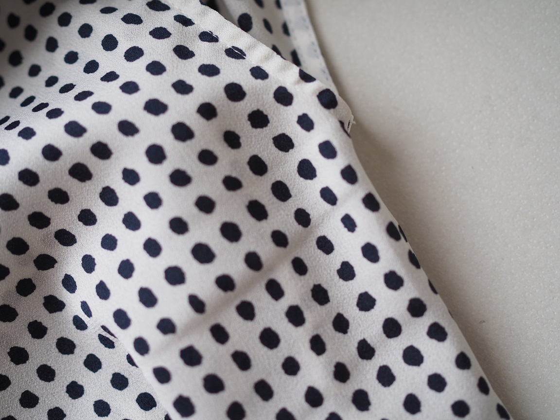 手描き風のクラシックなドットがレトロなムードを醸し出すブラウス。コンパクトなスクエアシルエットで、スタイリングしやすいのが魅力です。ネックのリボンは毎朝結ばなくてもいいように縫い留めてあるのもうれしいポイントです。