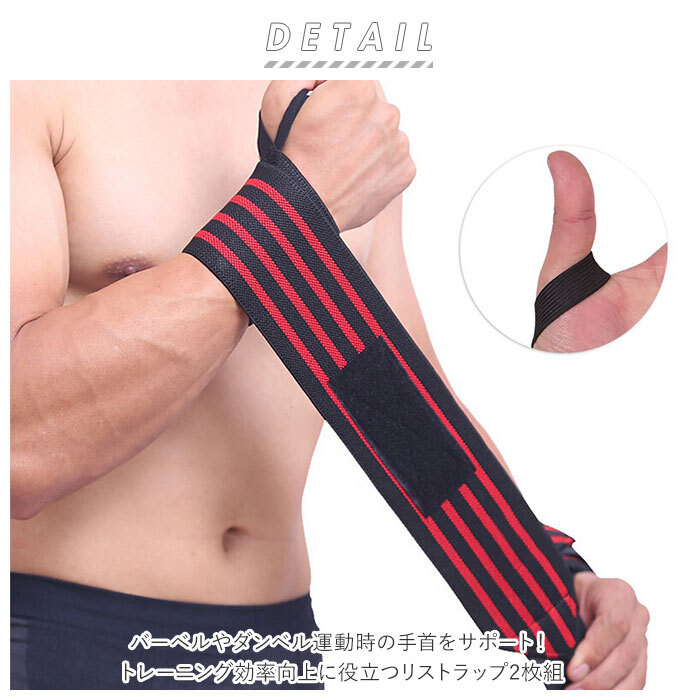 商品説明・バーベルやダンベル運動時の手首をサポート!トレーニング効率向上に役立つリストラップ2枚組。