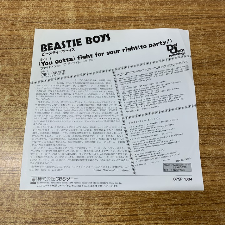Product name: ●01)【同梱不可】【見本盤】ビースティ・ボーイズ/Beastie Boys/ファイト・フォー・ユア・ライト/07SP 1004/EPレコード/7インチ/国内盤/A