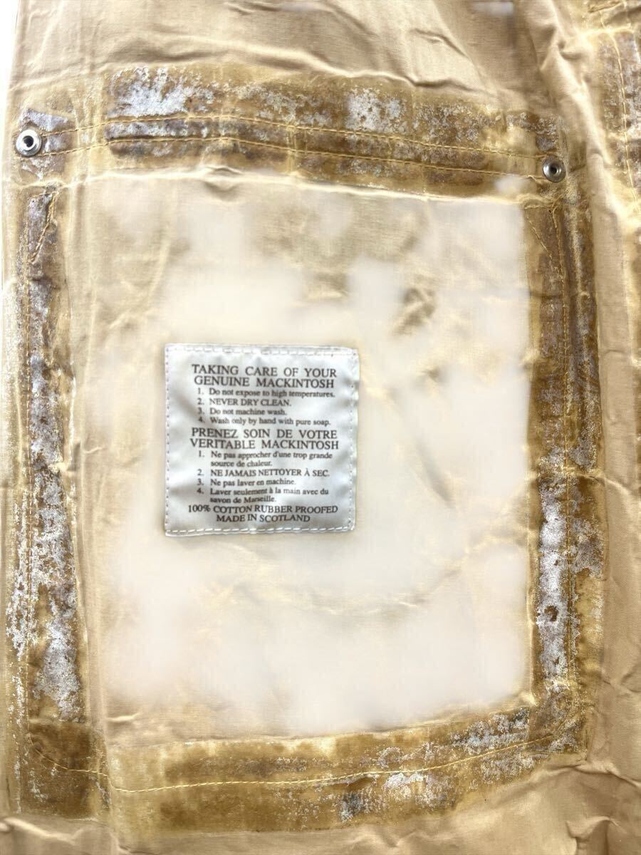 ※こちらは中古品です。コットン素材ですが全体的に素材がシワっぽく固くなっており、ゴム引きコートのような固さです。内側や襟裏は熱を当てたような跡が見られます。画像でご確認下さいませ。