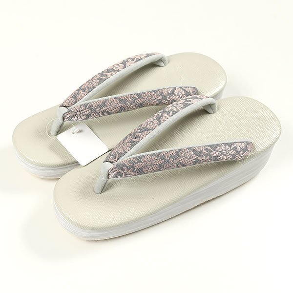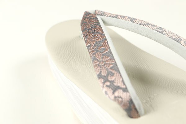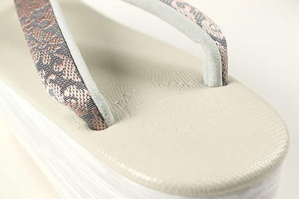 鼻緒には、鼠色地にピンク色で花模様が織り上げられた博多織の生地が使われており、薄グレー色の裏地が付いた鼻緒がすげられております。
