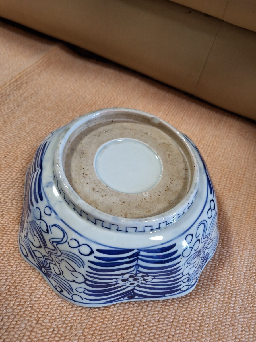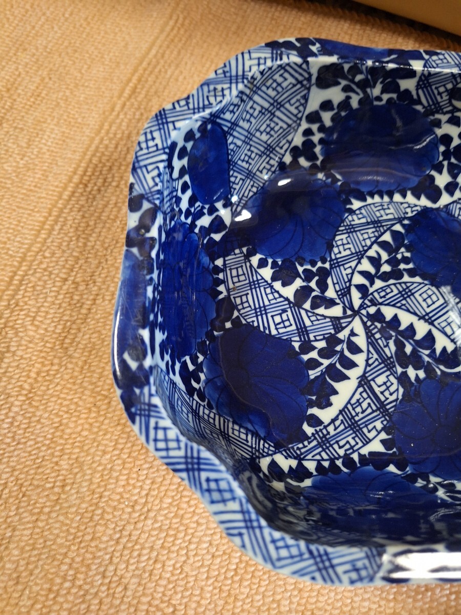 伊万里、染付ねじり文鉢です。縦、横約22cm、高さ約8cm、裏面の高台に、カケた部分がありますが、釉薬がかかっているので、製造時のキズと思います。