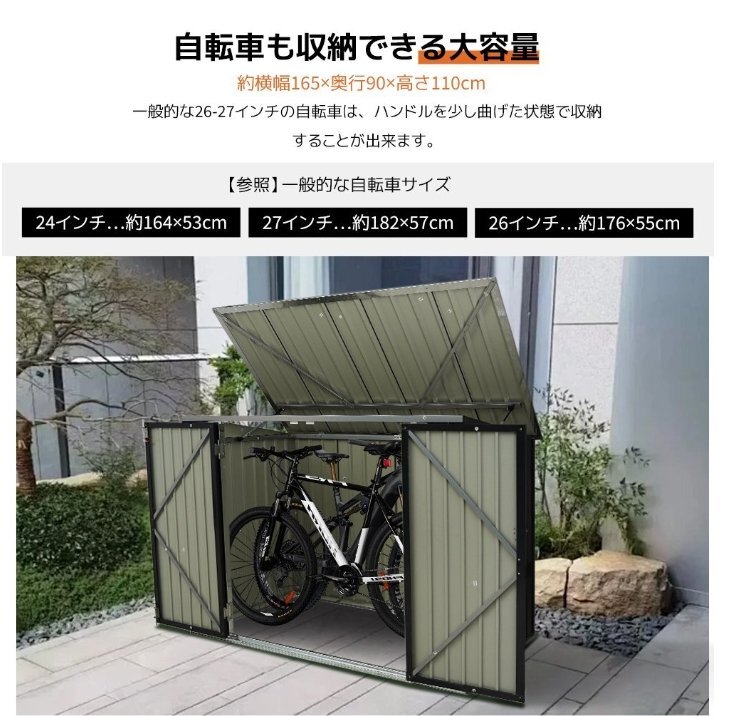 • 【大容量でしっかり収納】たっぷり収納でき、自転車やベビーカー、交換用のタイヤやDIY道具、汚れやすいガーデン用品やアウトドア用品の収納にも。一般的な26-27インチの自転車は、ハンドルを少し曲げた状態で収納することが出来ます。