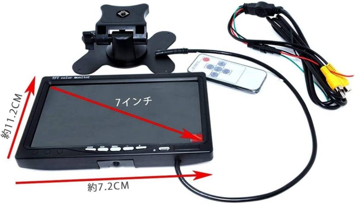 7インチTFT液晶モニター・オンダッシュ固定スタンド・専用リモコン・電源ケーブル・バックカメラ・角度固定・取付ねじ・電源ケーブル