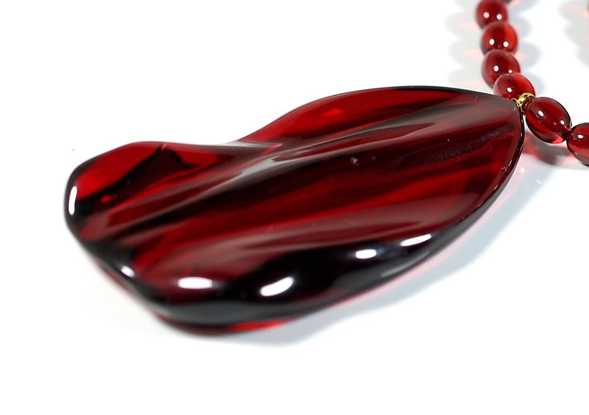 爽やかなレッド 照り  透明感 どれも良い 本物の琥珀ネックレスです